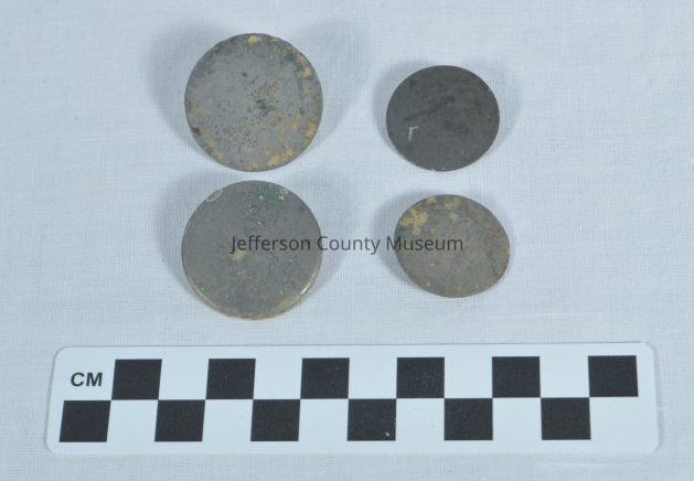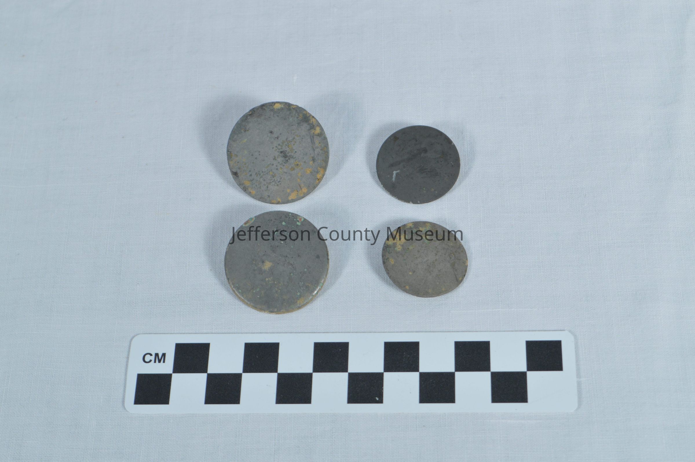 Four tombac buttons with flat, smooth tops and shanks on back (a-d). Large buttons are a and b, smaller buttons are c and d. From late colonial or early antebellum period, excavated in Jefferson County.Acquisition
