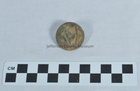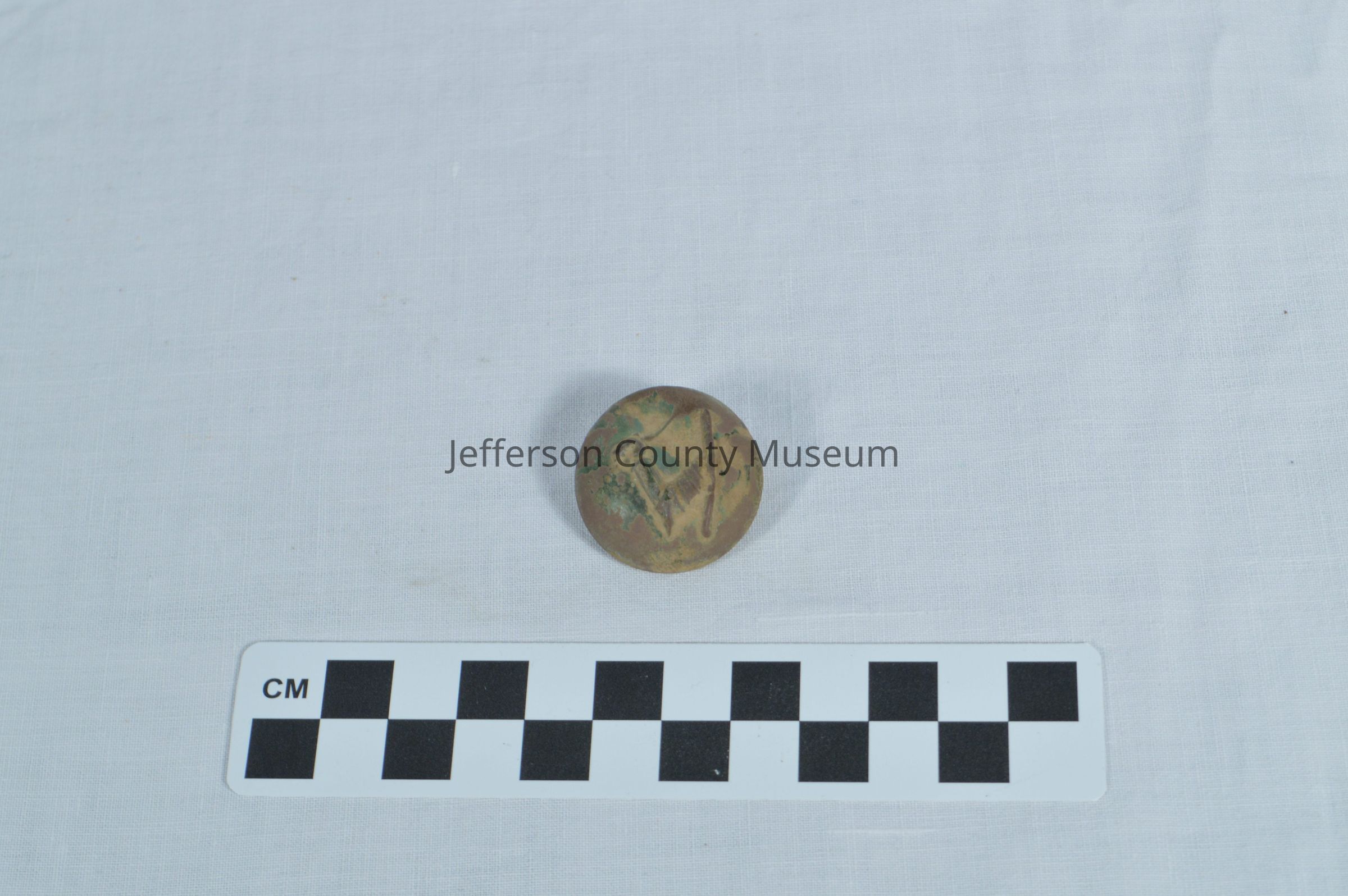 Livery button with rounded top with embossing of armor-covered arm bent at the elbow, holding a sword. Shank on bottom of the button. From late colonial or early antebellum period. Excavated in Jefferson County.Acquisition