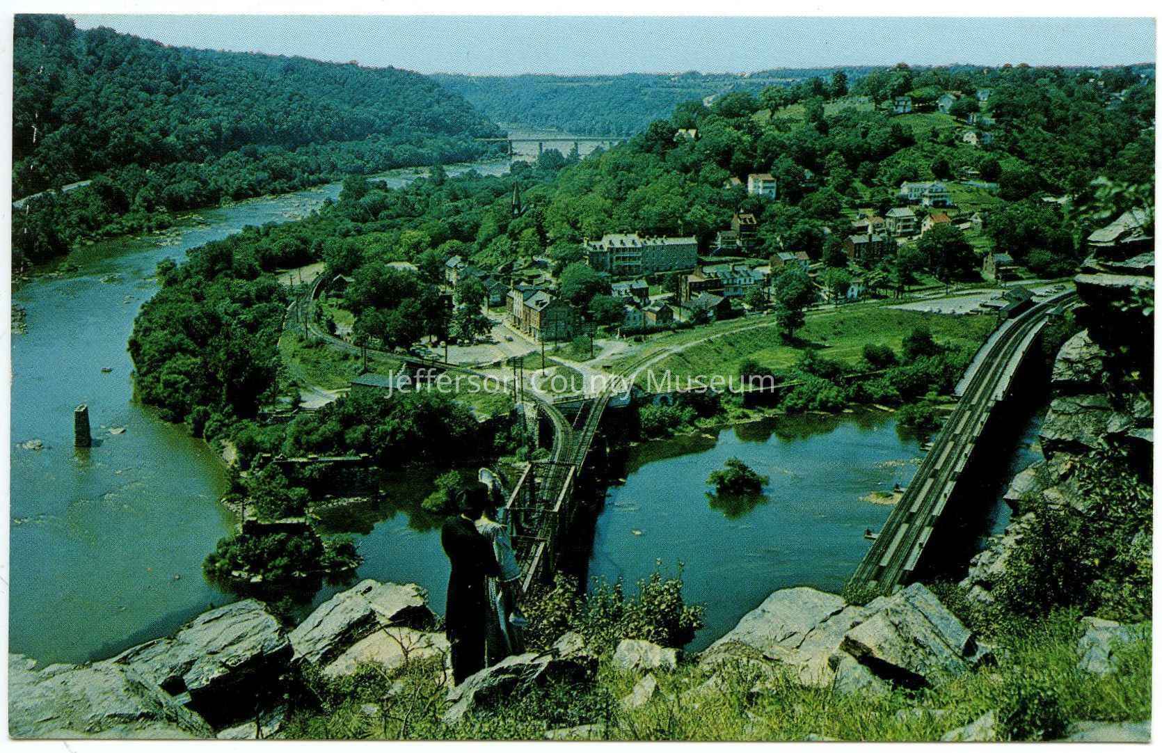 A view of historic Harpers Ferry, W. Va., scene of the nation-rocking raid led by John Brown on the U.S. Arsenal in 1859. The area is now under supervision of the National Park Service and is designated Harpers Ferry National Monument. Restoration is in progress. To the left is the Shenandoah River and on the right is the Potomac. West Virginia Industrial & Publicity Commission.Acquisition