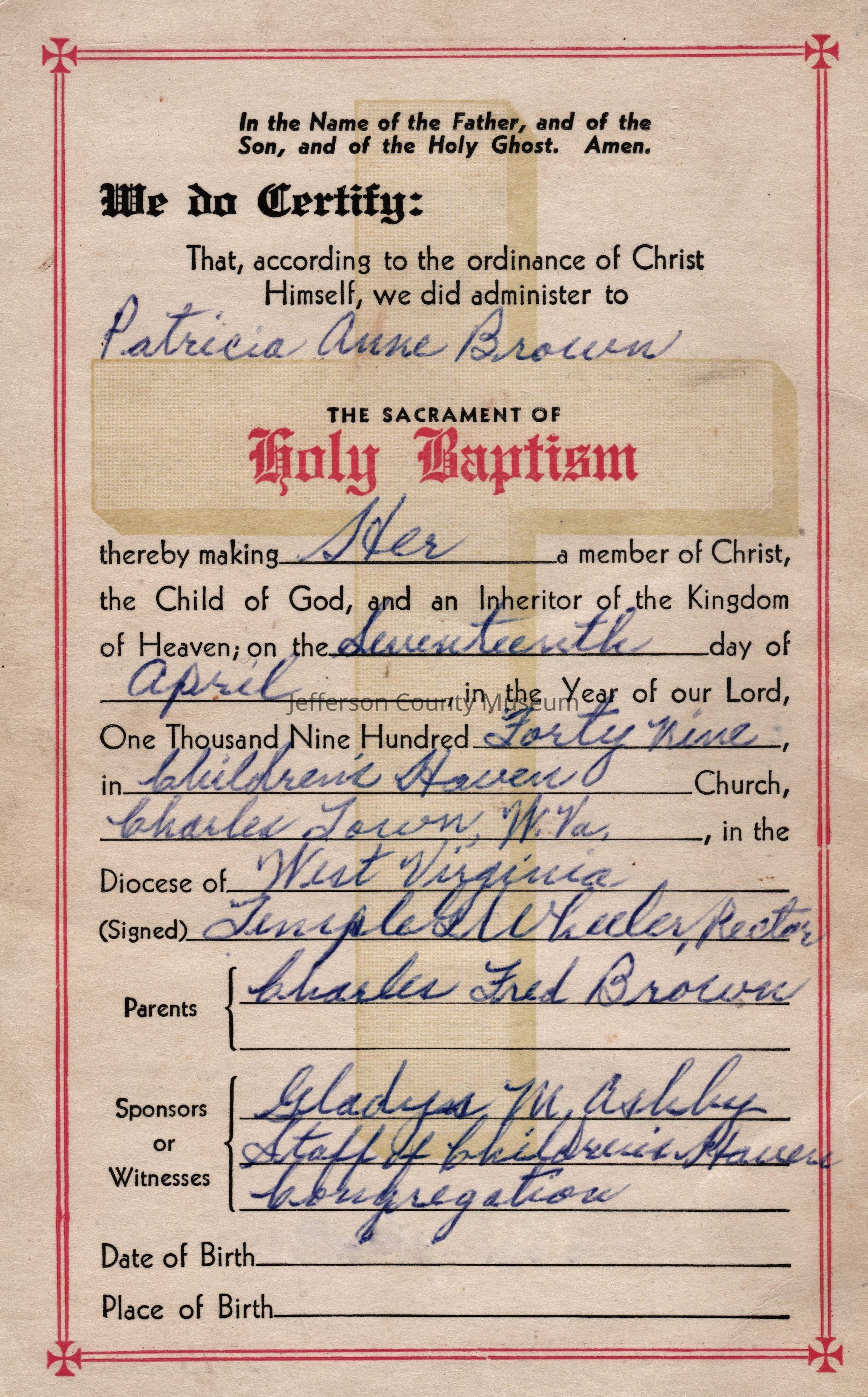 Digital image of baptism certificate of Patricia Anne Brown at the Children's Haven Church in Charles Town.Acquisition