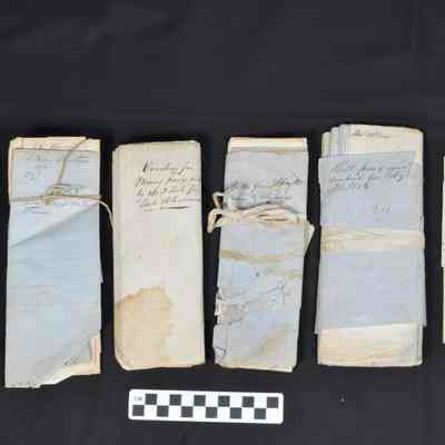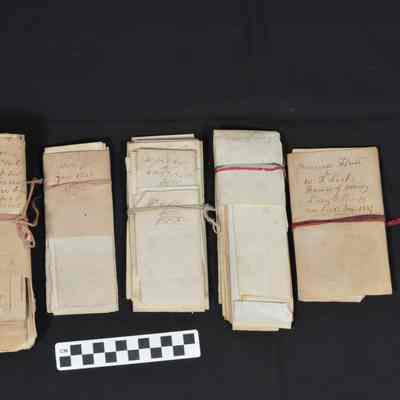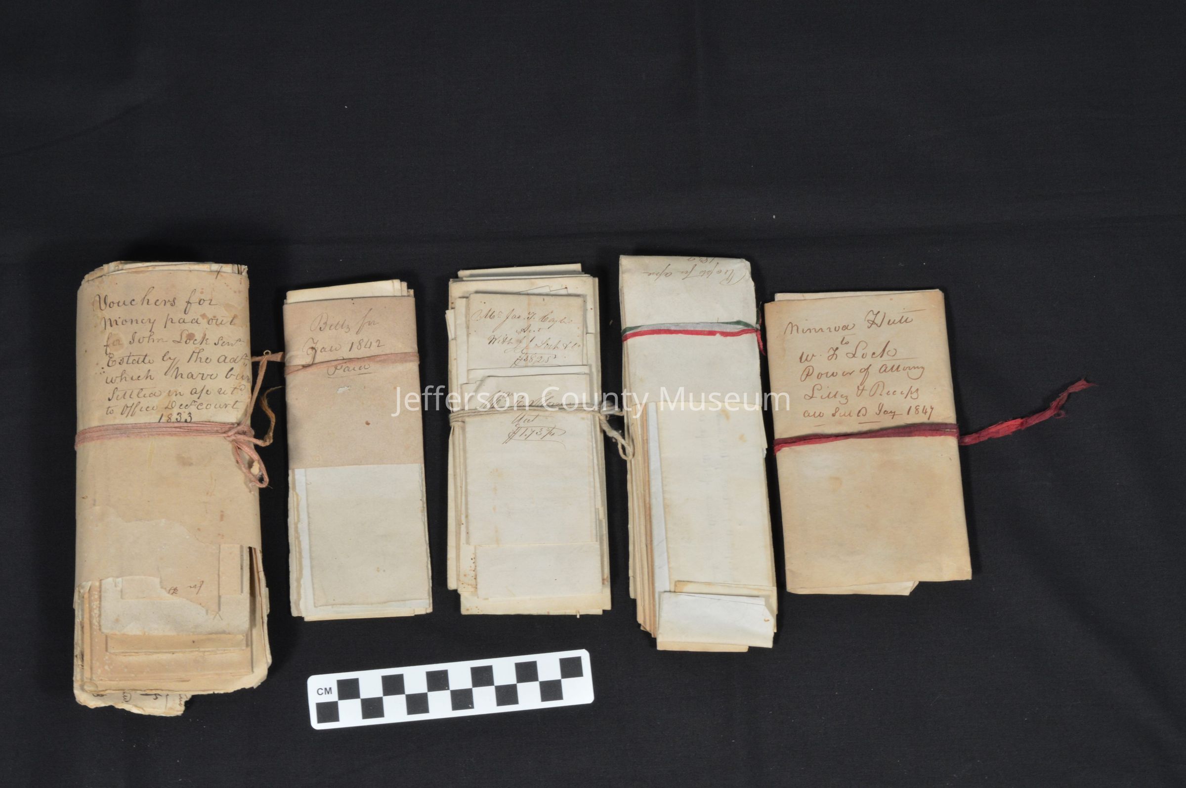 Documents related to the estate of John Lock (1746-1831), father of William French Lock, were in 17 packets each secured by a paper wrapper, thread, thin rope, or ribbon. Photos of some of these packets are in Media. Documents from the packets are filed in folders by packet numbers 1 to 17. The 17th packet, a very large one, contained loose papers and 11 smaller packets of documents. The folder labeled Packet 17-1 to 17-11 contains documents from the 11 packets. The folder labeled Packet 17 (Loose papers) contains the wrapper for Packet 17 and loose papers in chronological order.Acquisition