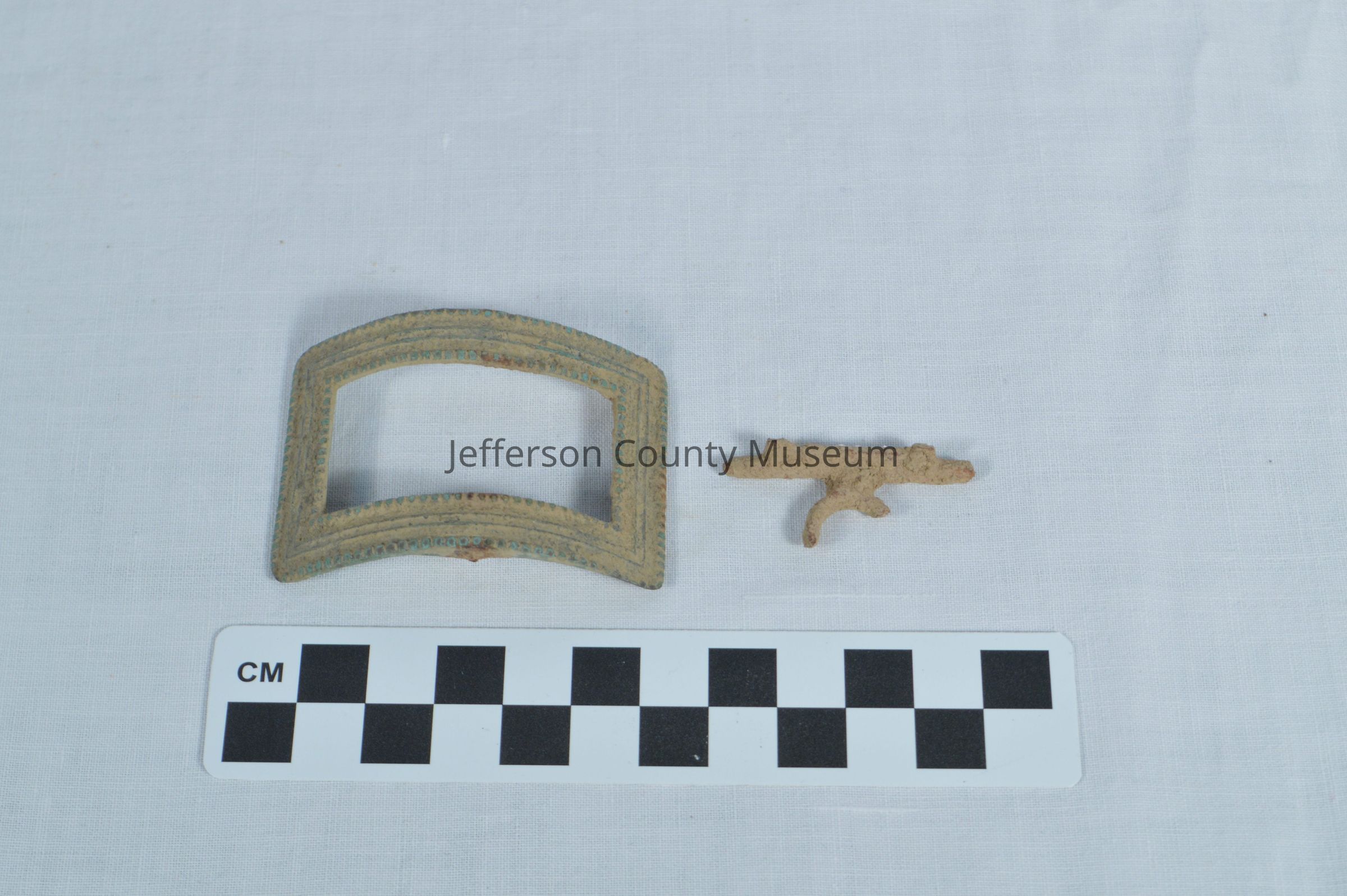 Sash buckle that is rectangular and curved (a). Pin piece is separated from buckle (b). Design of two rectangular lines and dots along inside and outside of the front of the buckle. From late colonial or early antebellum period, excavated in Jefferson County.Acquisition