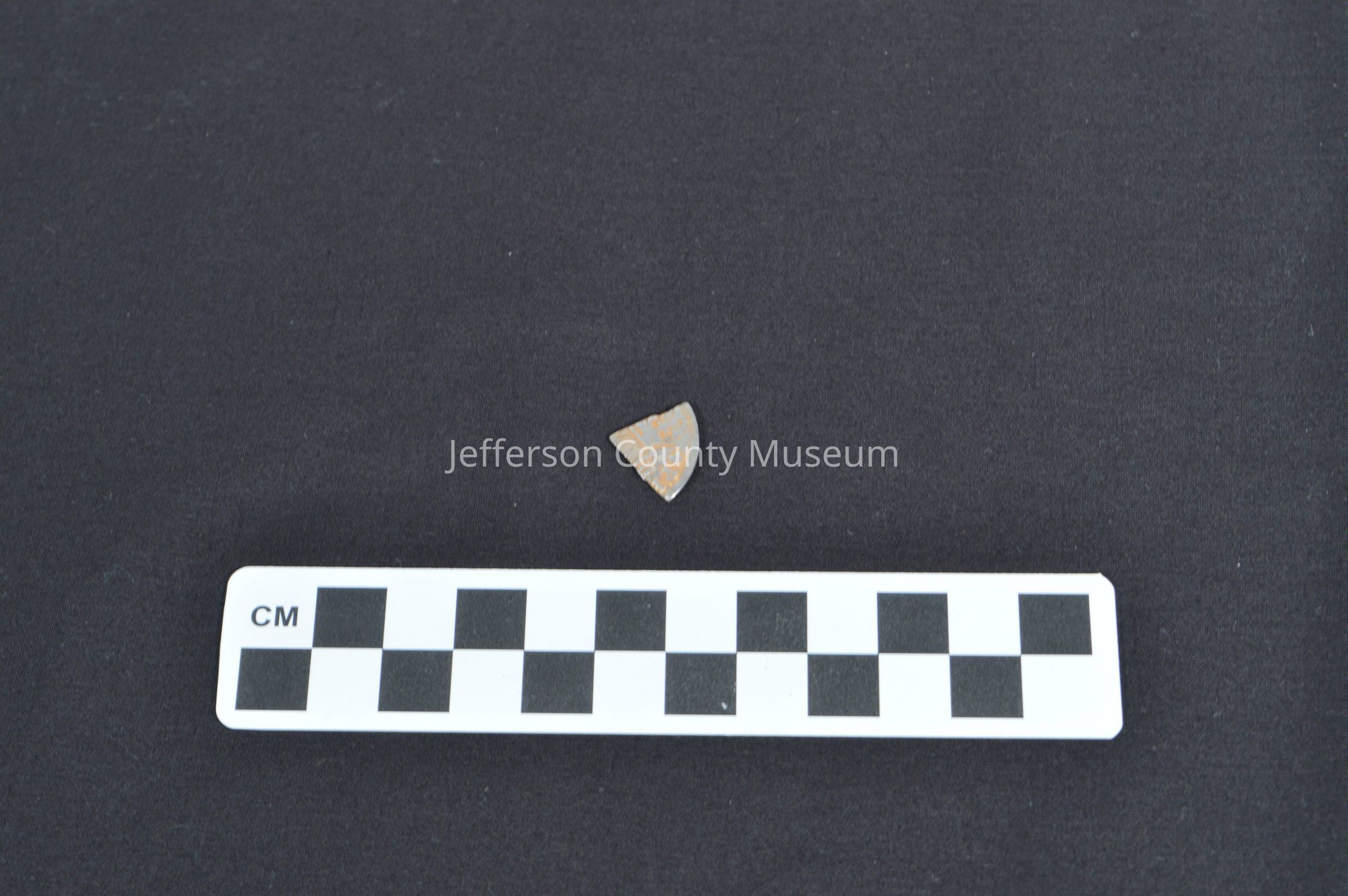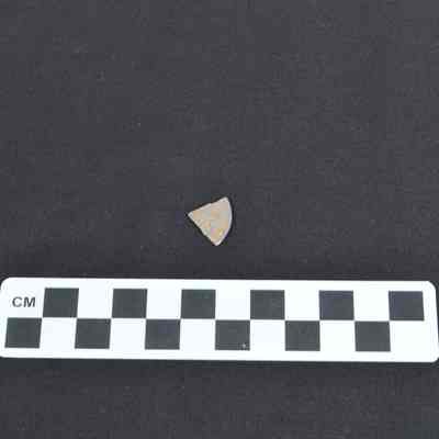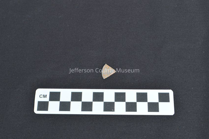 Spanish two-bit coin, 1730-1746. On one side of coin are letters E X and I. On other side of coin is letter P and part of a crown and shield logo. Likely a piece of a Philip V 2 reale coin. From late colonial or early antebellum period.Acquisition