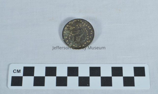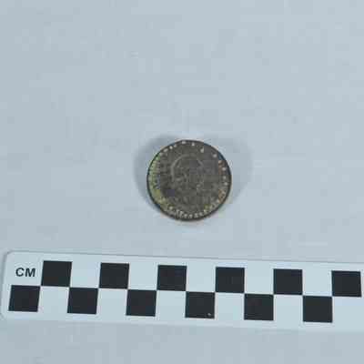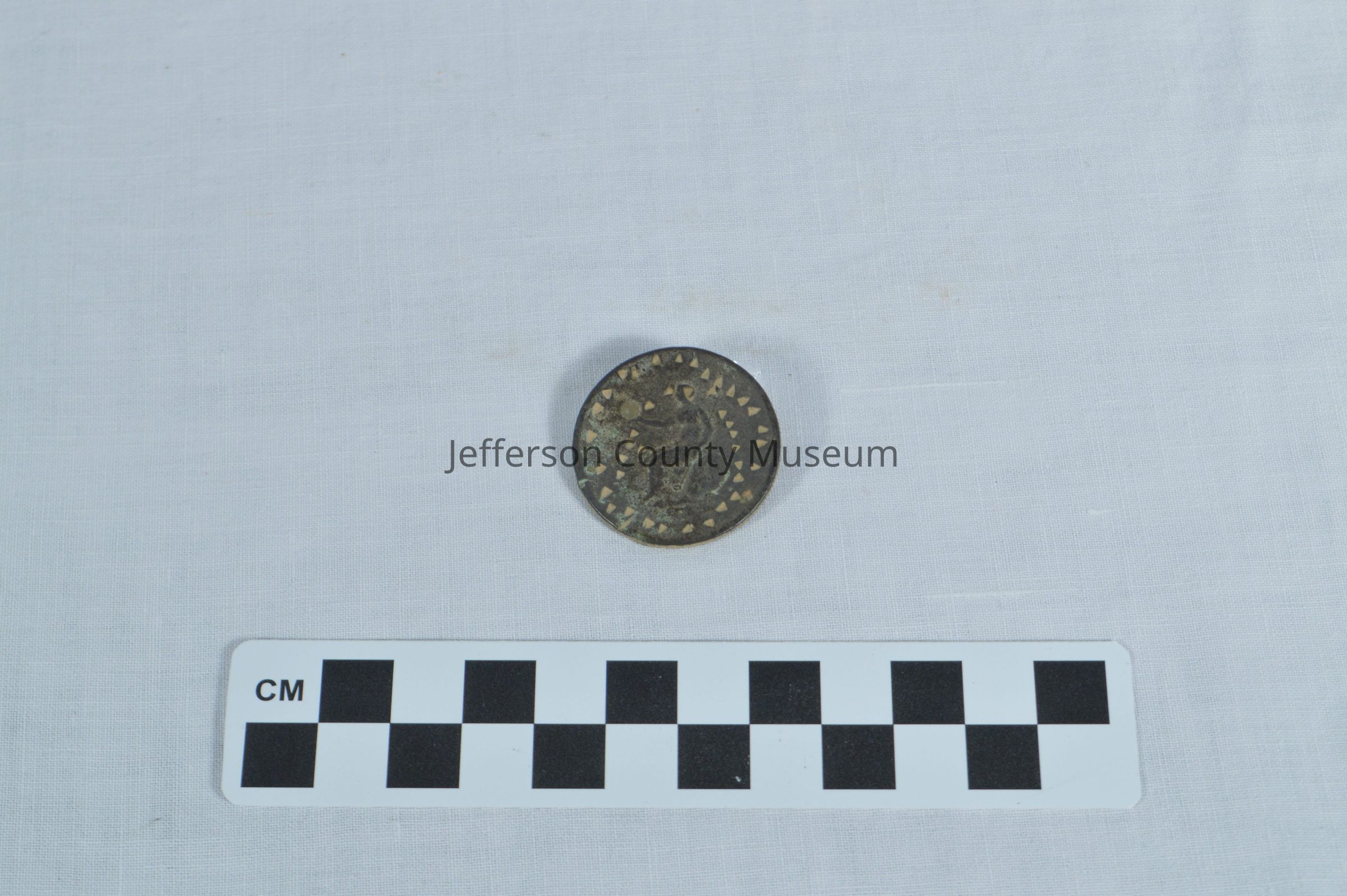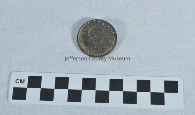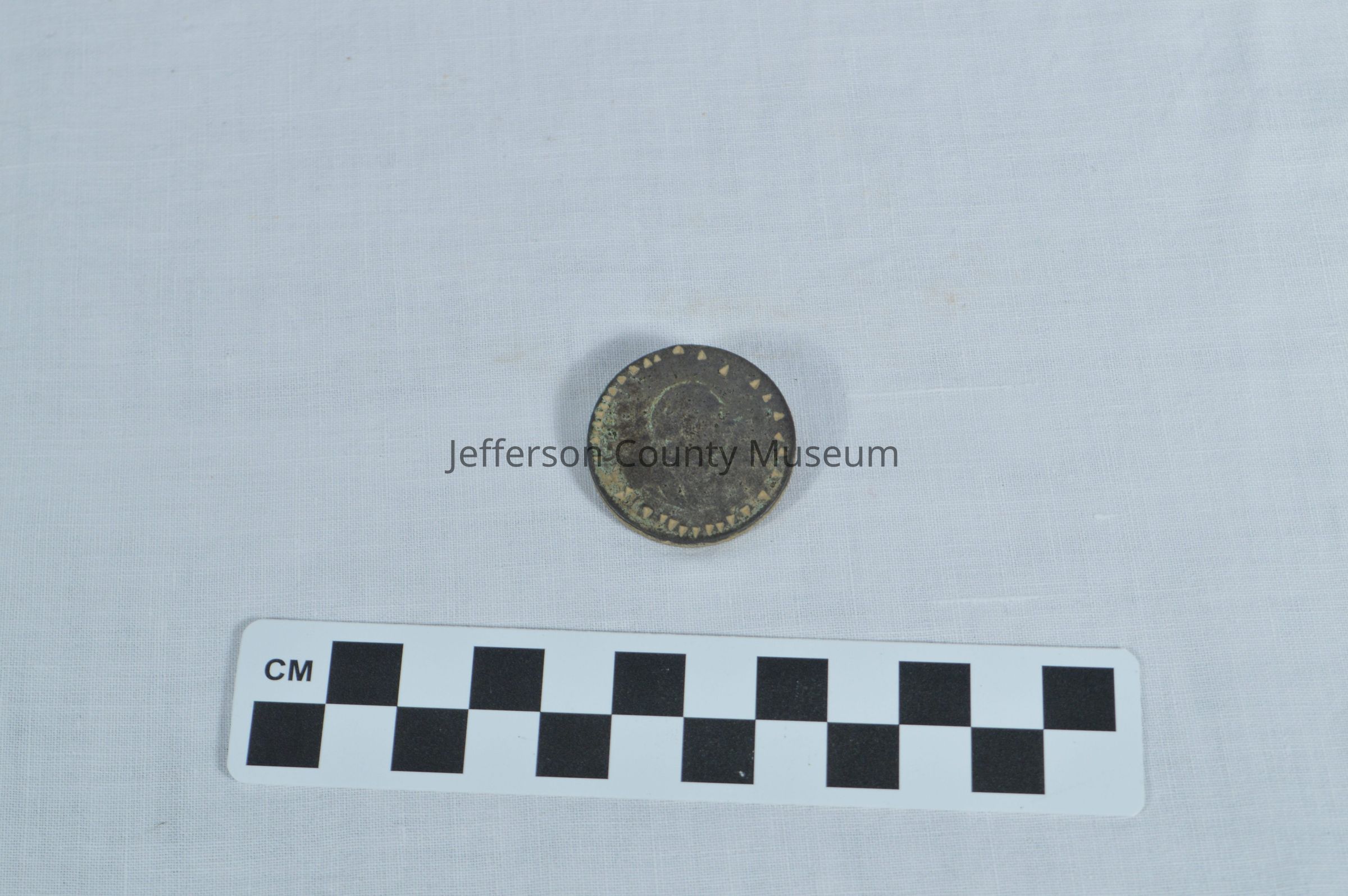 British halfpenny coin. On front of coin is worn down bust of individual. On back of coin is image of an individual sitting and holding a staff. On both sides of coin are small triangular impressions that the donor believes were made by the end of a bayonet and were possibly done to obscure writing on coin.Acquisition