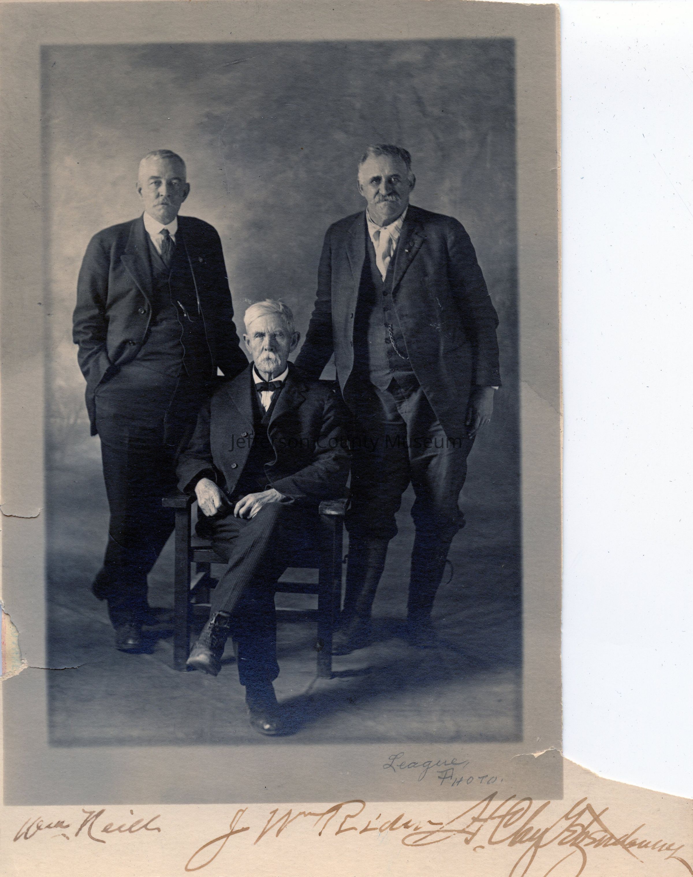 Three men in suits and ties, two standing, one seated. Names handwritten in brown ink at bottom "Wm. Neill J W Rider H. Clay Getzendanner". Handwritten in pencil at bottom right "League Photo".Acquisition