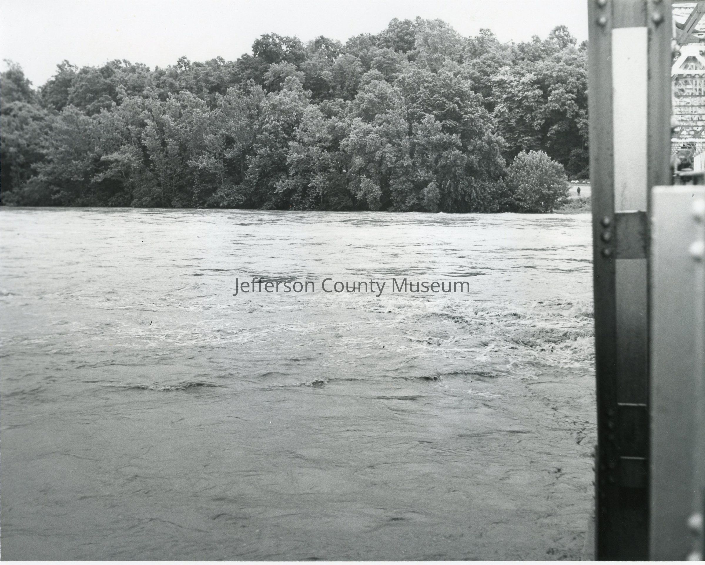 Shenandoah River at floodstage In June 1972 after Hurricane Agnes. Photo is taken on the downstream side of the Bloomery Bridge. The edge of the bridge is visible along the right edge of the photograph.