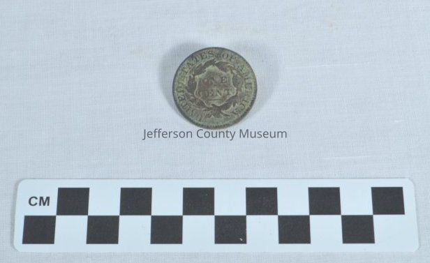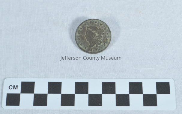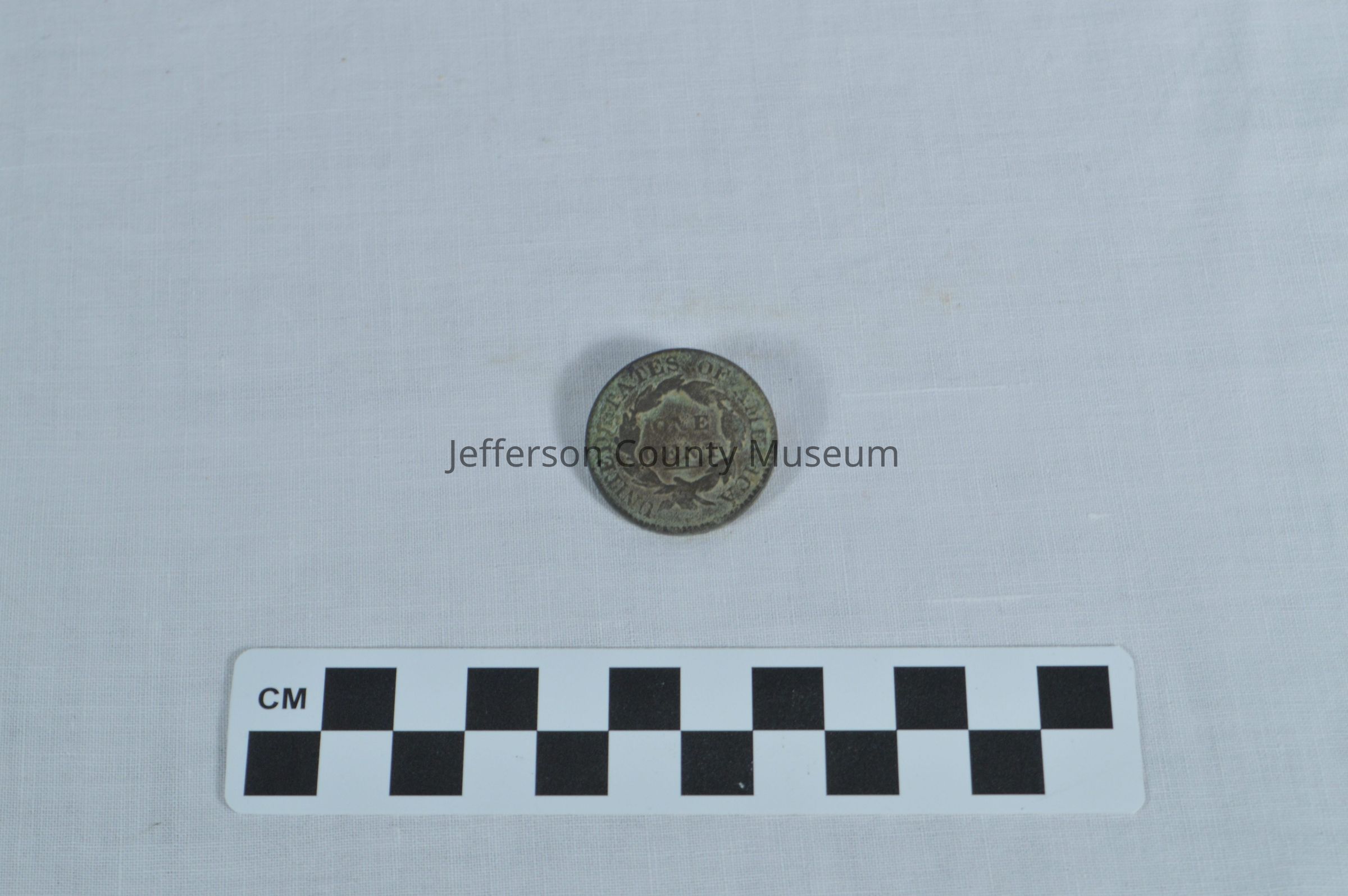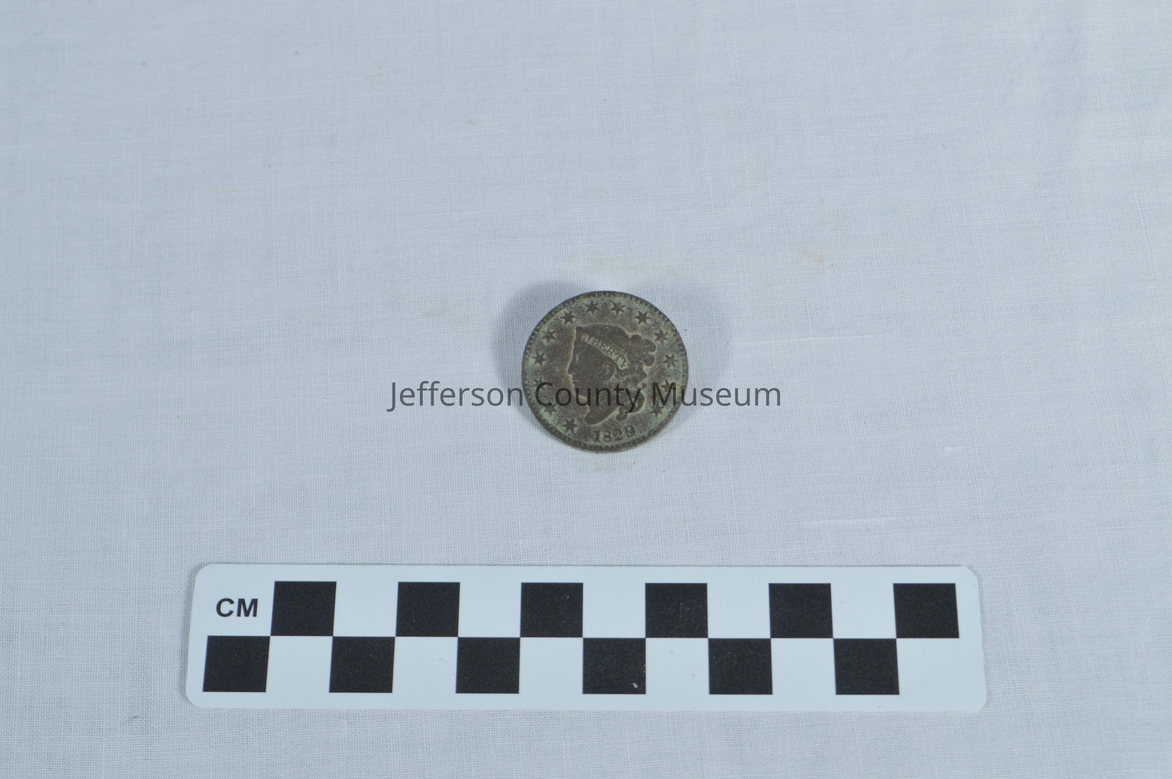 US large-cent coin, 1829. On the front of coin is a bust of Lady Liberty facing leftwards. Inscribed on a band on Lady Liberty's head is the word LIBERTY and the year 1829 is at the bottom of the coin. Around the outer edge are 13 stars. On the back of the coin is the inscription ONE CENT surrounded by an ornate wreath. Surrounding this are the words UNITED STATES OF AMERICA.Acquisition