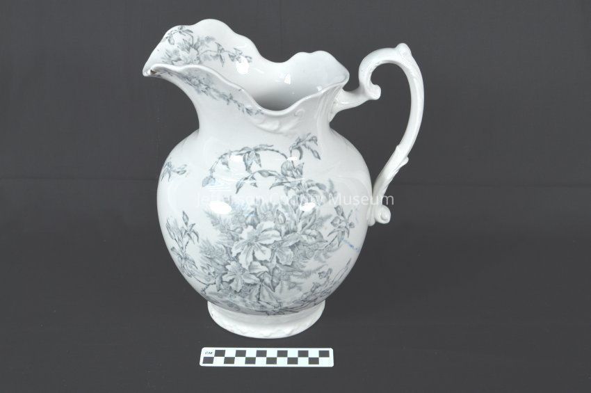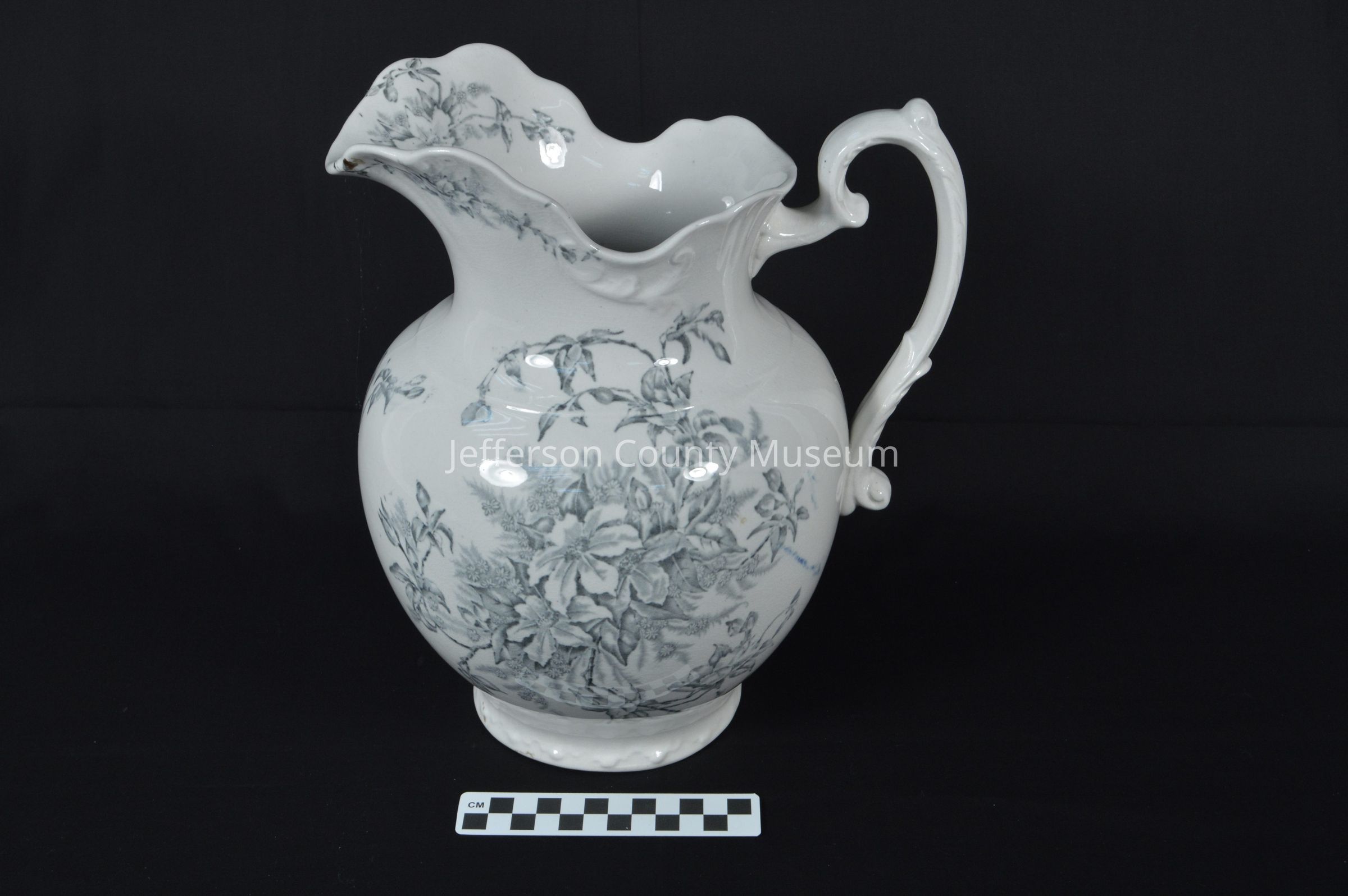 White ceramic pitcher with gray, floral pattern. Mark on bottom of bowl shows a world globe with latitude and longitude lines and a sword striking through it. Arched above the globe are the words: BONA FAMA EST. Underneath the globe are the words: MELIOR ZONA AUREA. Beneath the mark are the words: ALBA CHINA. Circa 1920.