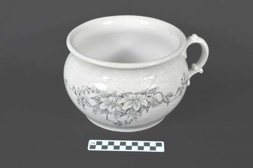 White ceramic chamber pot with gray, floral pattern. Mark on bottom of bowl shows a world globe with latitude and longitude lines and a sword striking through it. Arched above the globe are the words: BONA FAMA EST. Underneath the globe are the words: MELIOR ZONA AUREA. Beneath the mark are the words: ALBA CHINA. Circa 1920.