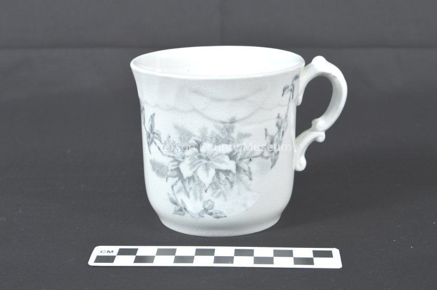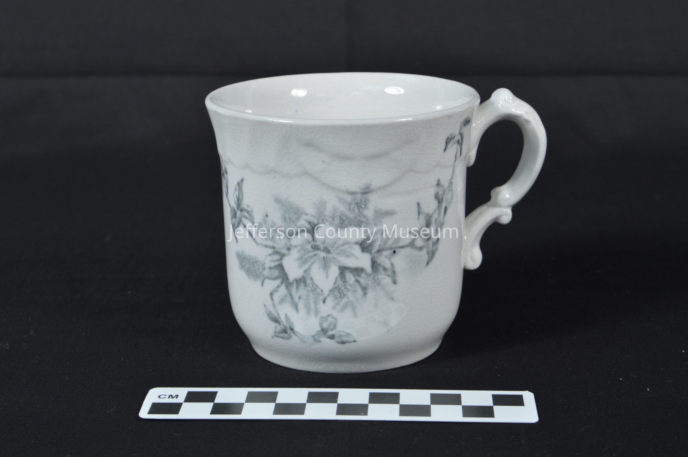 White ceramic cup with gray, floral pattern. Circa 1920.