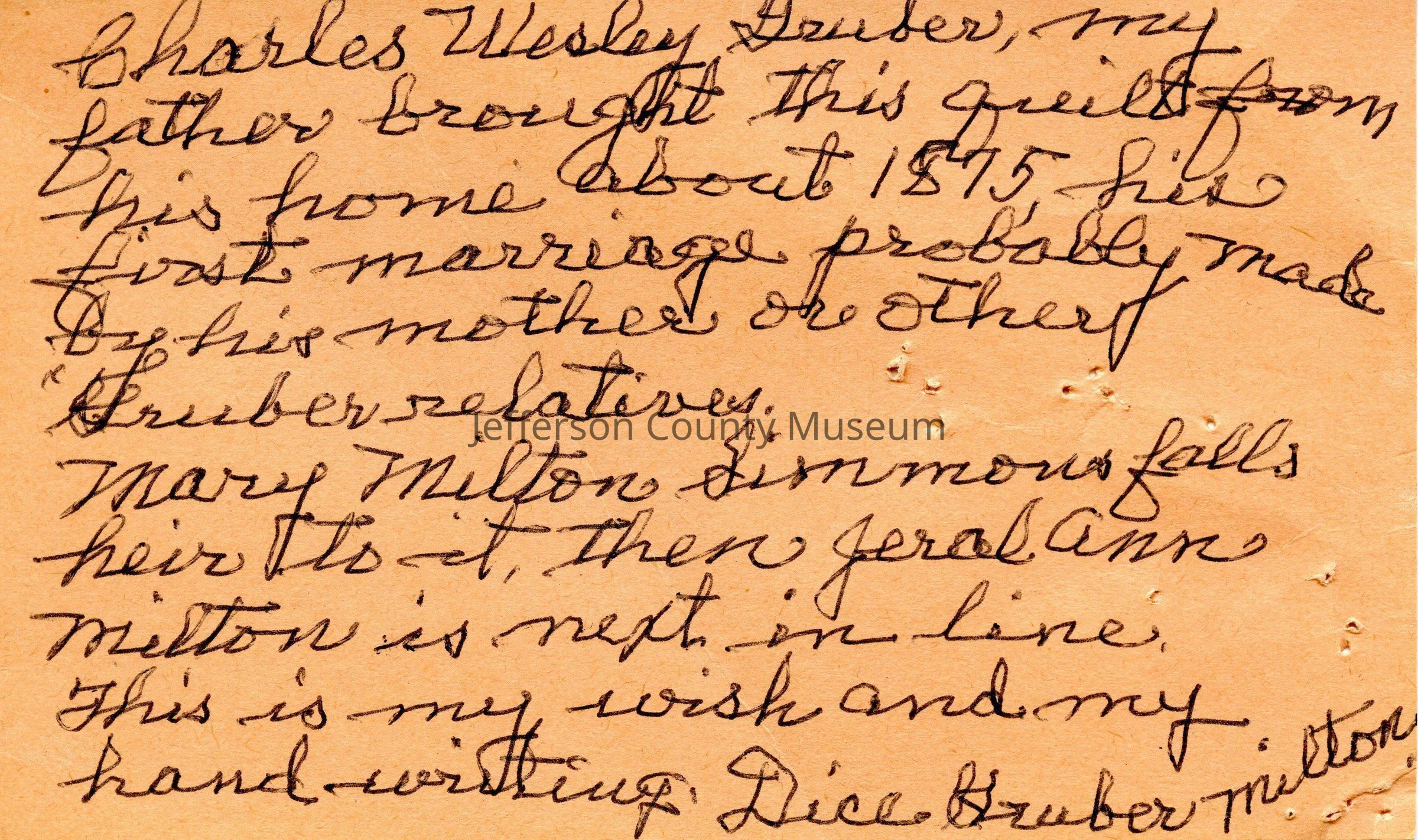Orange-color index card with handwriting in ink. Handwriting is that of Carlotta Dice Gruber Milton and card accompanied quilt cataloged as object 1143 (Gruber family quilt). Card gives provenance of the quilt according to Carlotta Dice Gruber Milton.Acquisition