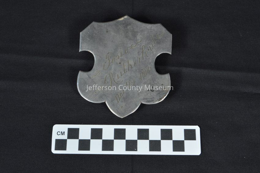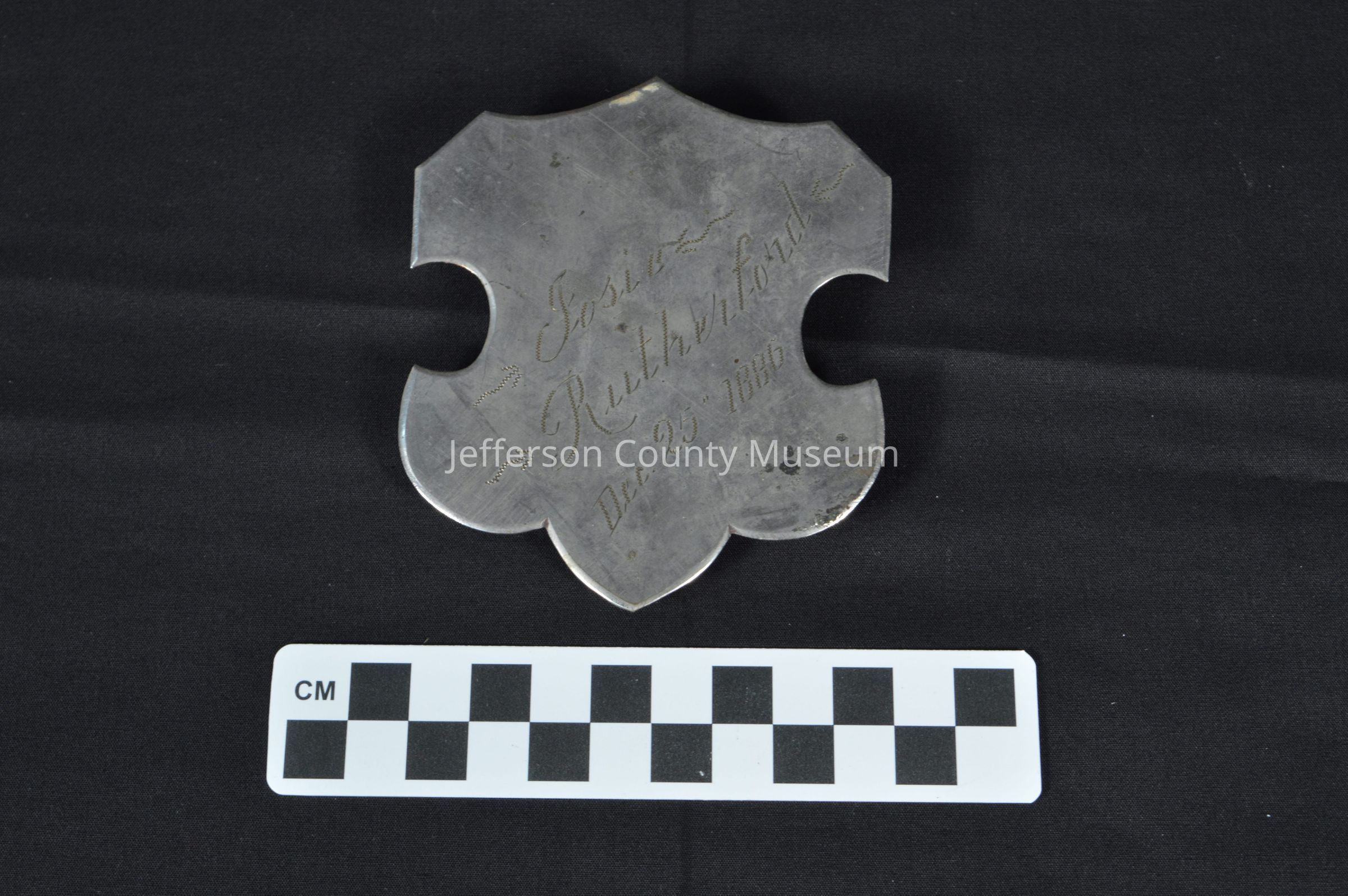 Sash buckle with "Josie Rutherford, Dec. 25 1886" engraved on front. Clasp on back.Acquisition