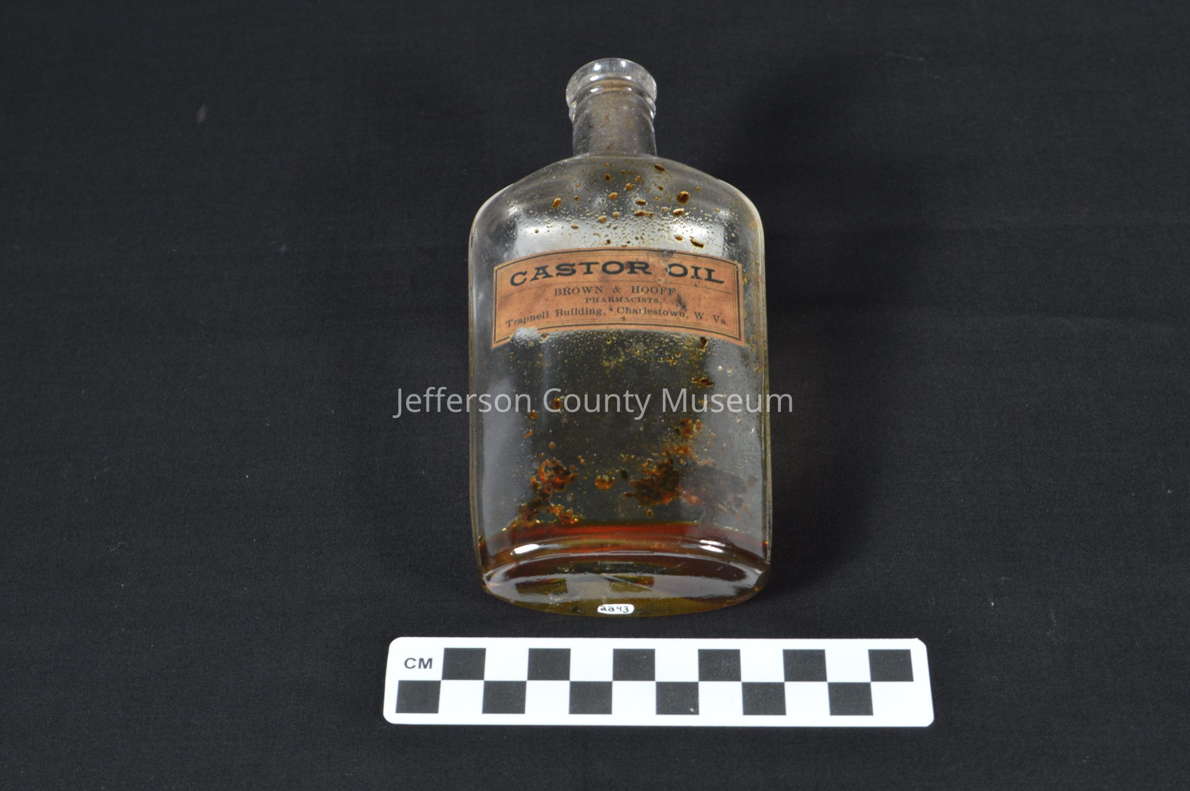 Glass pharmacy bottle, label reads: "Castor Oil, Brown & Hooff Pharmacists, Trapnell Building, Charlestown, W. Va."Acquisition