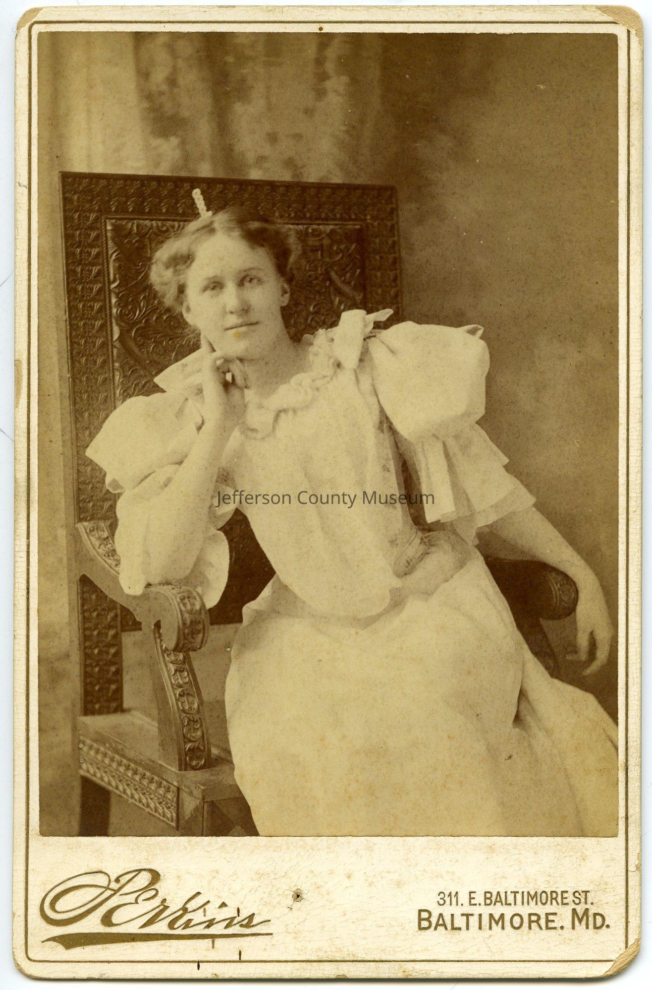 White woman in white dress sitting on chair. Written in cursive on back is "Hester Melvin Beall."Acquisition
