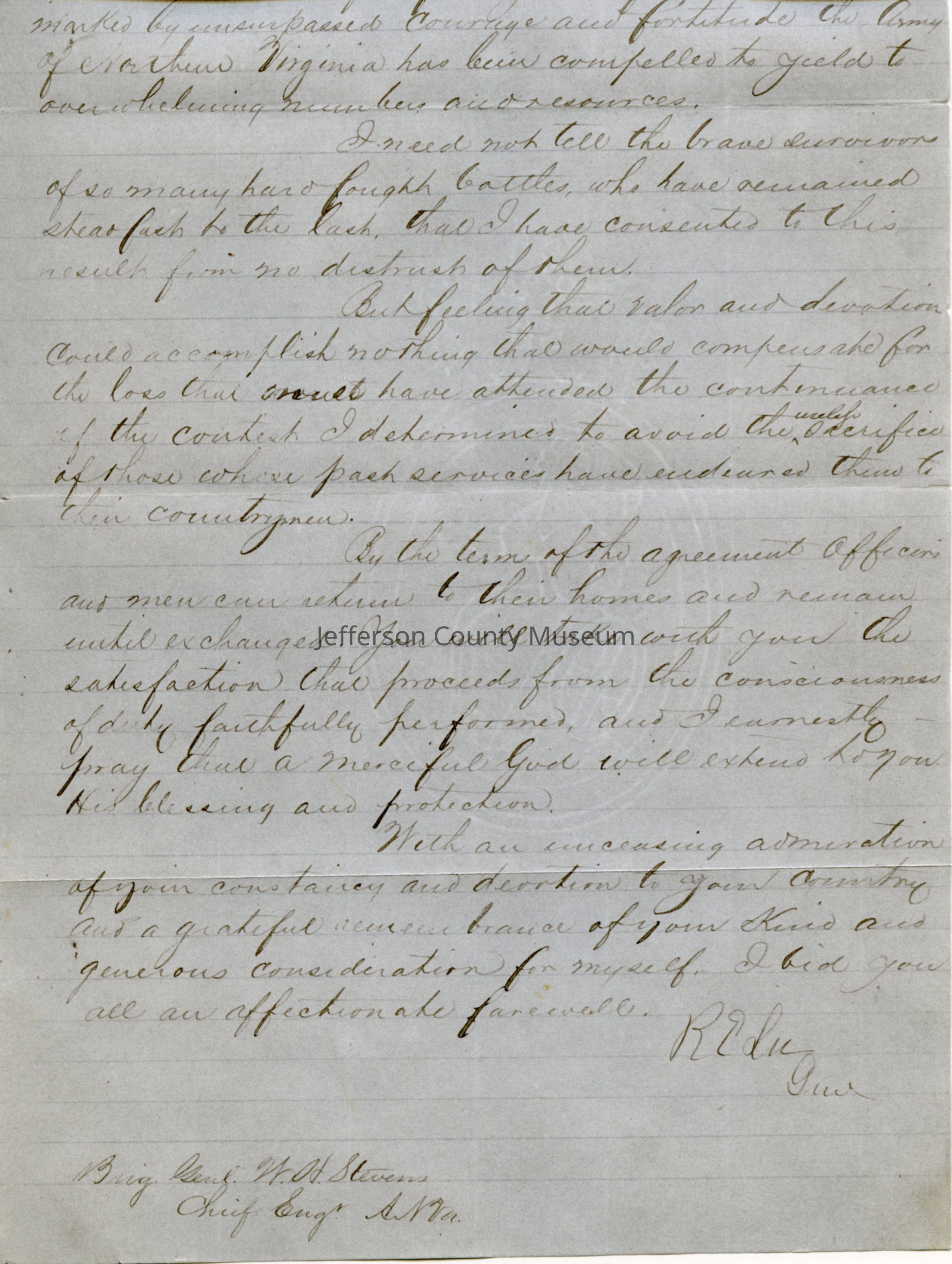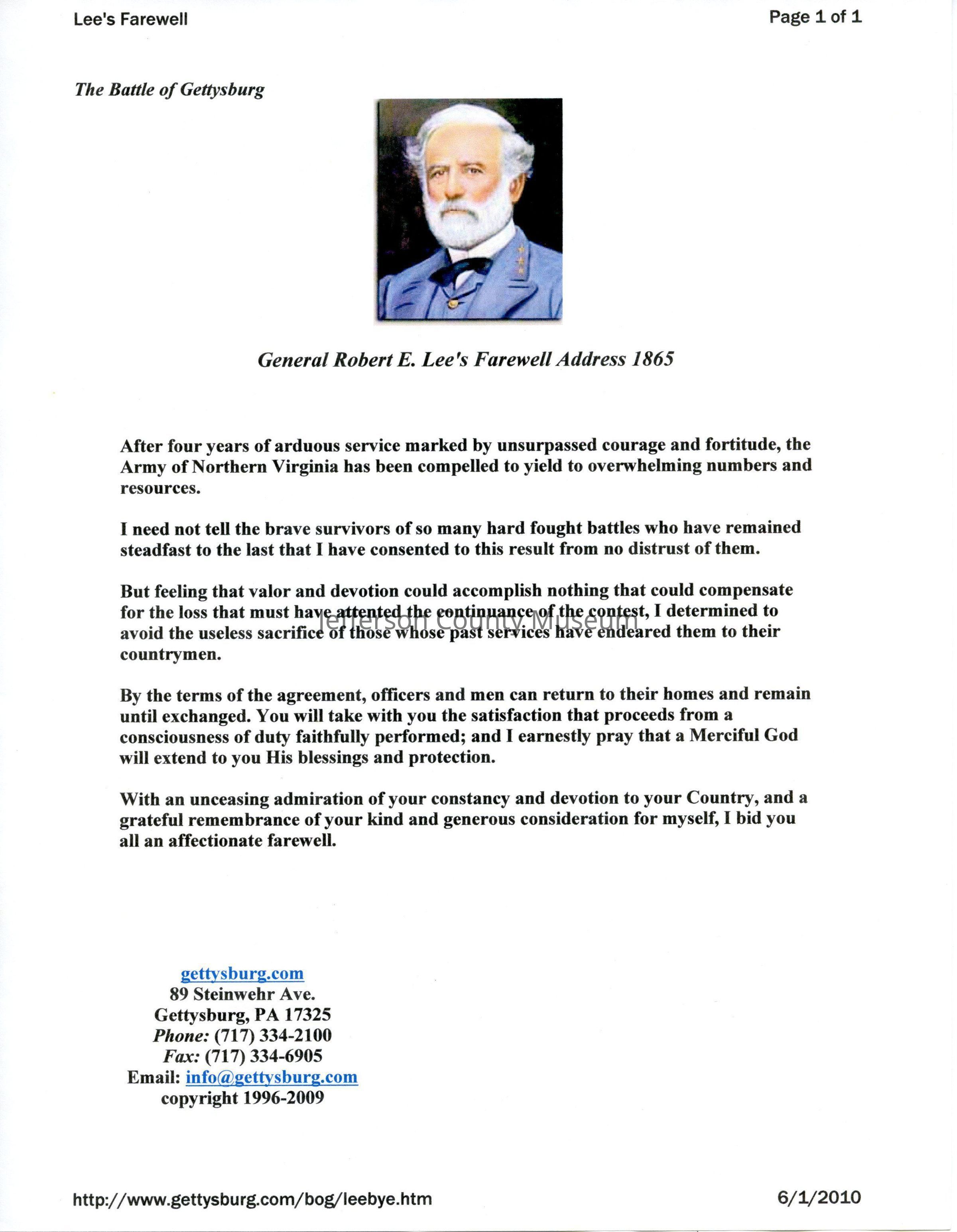 Copy of General Robert E. Lee's farewell address to the troops dated 10 April 1865. Packet includes a copy of the handwritten address, a typed copy of the address, and text from letters exchanged between General Lee and General Grant.Acquisition