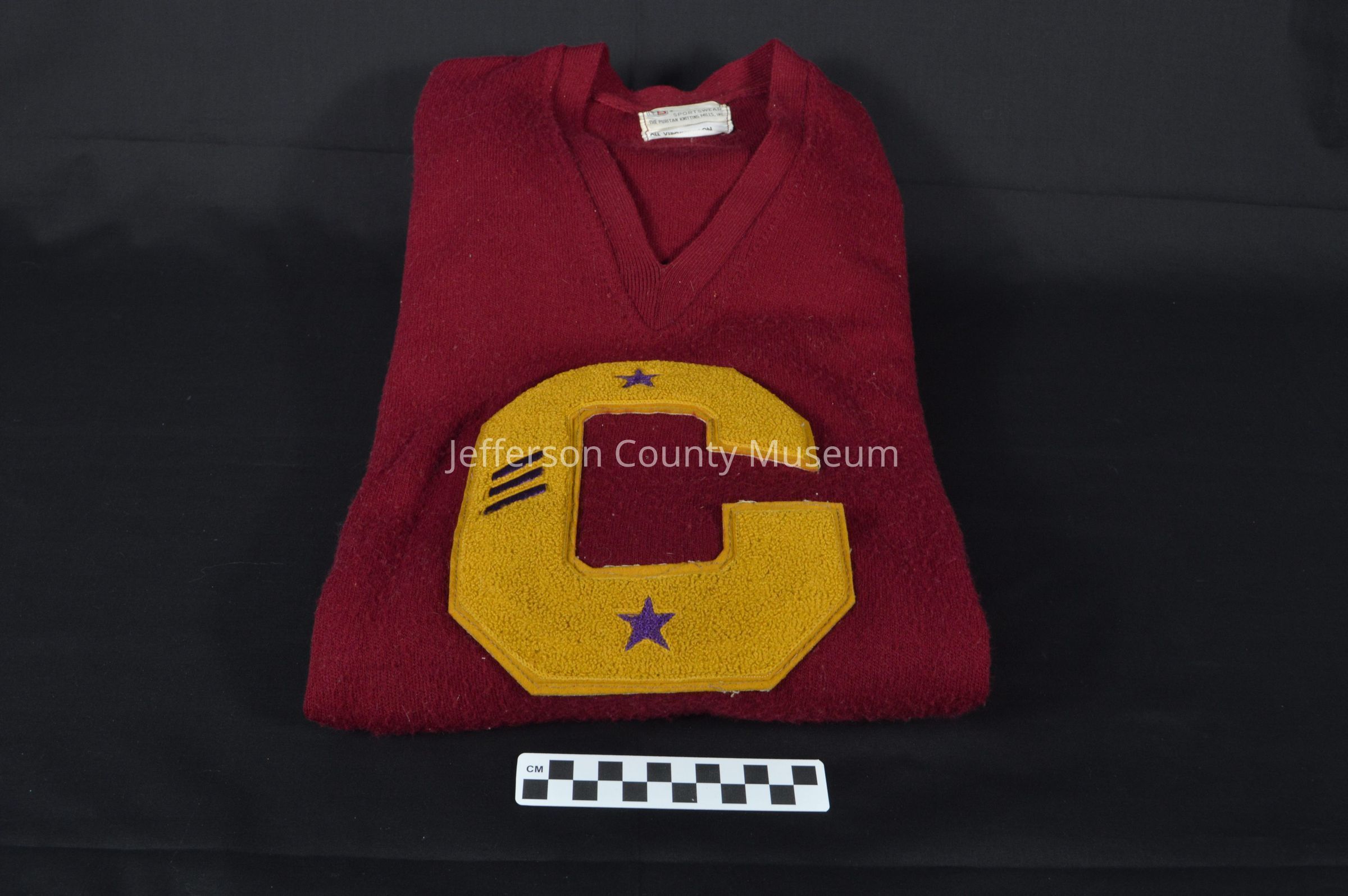 Burgundy nylon Charles Town High School letter sweater with gold letter "C." On the letter "C" are two purple stars on top and bottom of the letter and three purple stripes on the curve of the letter. Tag reads: "Puritan Sportswear, The Puritan Knitting Mills, Inc."