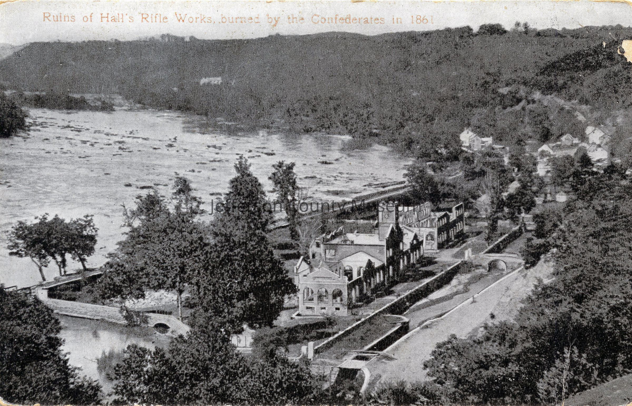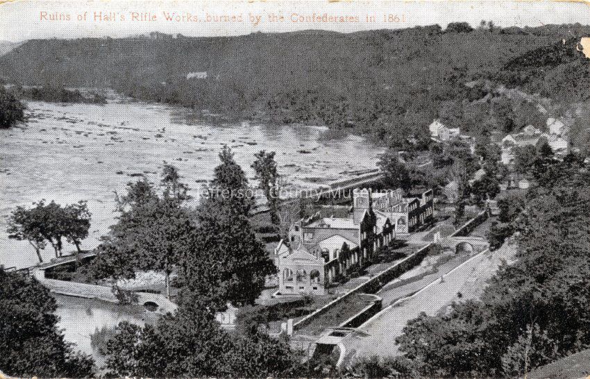 "Ruins of Hall's Rifle Works, burned by the Confederates in 1861. On correspondence side is Civil War scene of showing a soldier, cannon, hills and river. Above the scene is " SCENIC SOUVENIR of PICTURESQUE, HISTORIC HARPERS FERRY PUBLISHED BY W.L. ERWIN HARPERS FERRY, W.VA. COPYRIGHT 1908 ".Acquisition