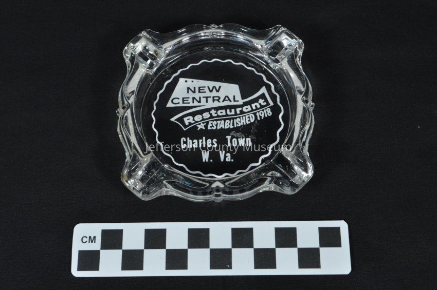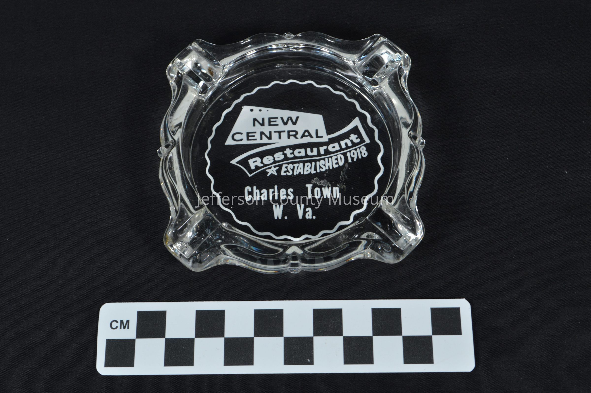 Circular clear glass ashtray, advertising New Central Restaurant. There is a single groove on each corner for resting a cigarette. Reverse image on underside of the dish is a thin white circular border and inverted white text that reads: "New Central Restaurant, Established 1918, Charles Town, W. Va."Acquisition