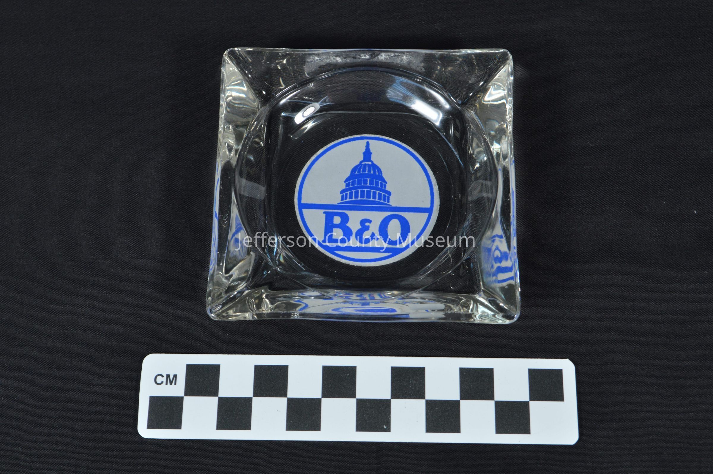 Clear glass ashtray, with square border and circular dish, advertising B & O Capitol Limited train. Reverse image on underside of the dish is white circle, outlined in blue, with silhouette of US Capitol building and inverted blue text underneath that reads: "B & O."Acquisition