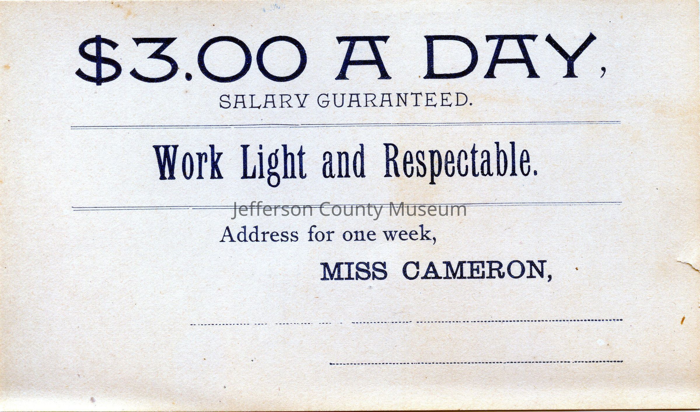 Printed in blue ink "3.00 A DAY, SALARY GUARANTEED. Work Light and Respectable. Address for one week,Acquisition