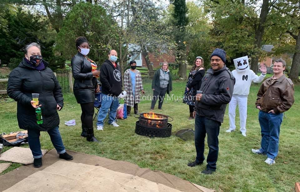 Summary provided by donor: "There were four of us in the costume contest (not all people are visible). Roger Louis Goodwin dressed as Marshmello. Roger lives in Summit Point, WV. We are practicing social distancing and wearing face masks. The host and director (Lena) ensured everybody brought individually wrapped food, candy, and snacks --- no community bowls. Lena Etzkin (My Social Calendar Director) took the photo. It was cold that afternoon (high of 48 degrees) and cold that night (low of 38 degrees). Hence, we are standing around a fire pit. The host could easily have moved the party inside without the COVID-19 restrictions."