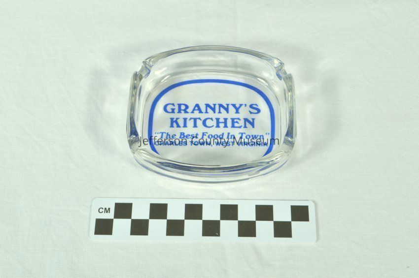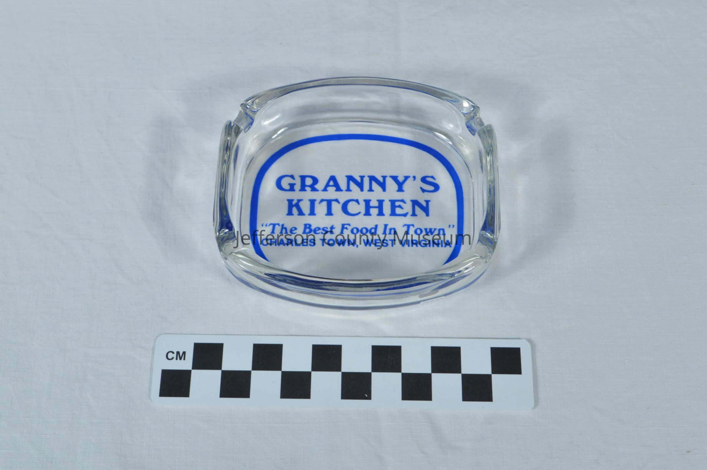 Rounded rectangular clear glass ashtray, advertising Granny's Kitchen. There is a single groove on each corner for resting a cigarette. Reverse image on underside of the dish is a thin blue circular boarder, with blue text: "Granny's Kitchen, 'The Best Food In Town,' Charles Town, West Virginia."Acquisition