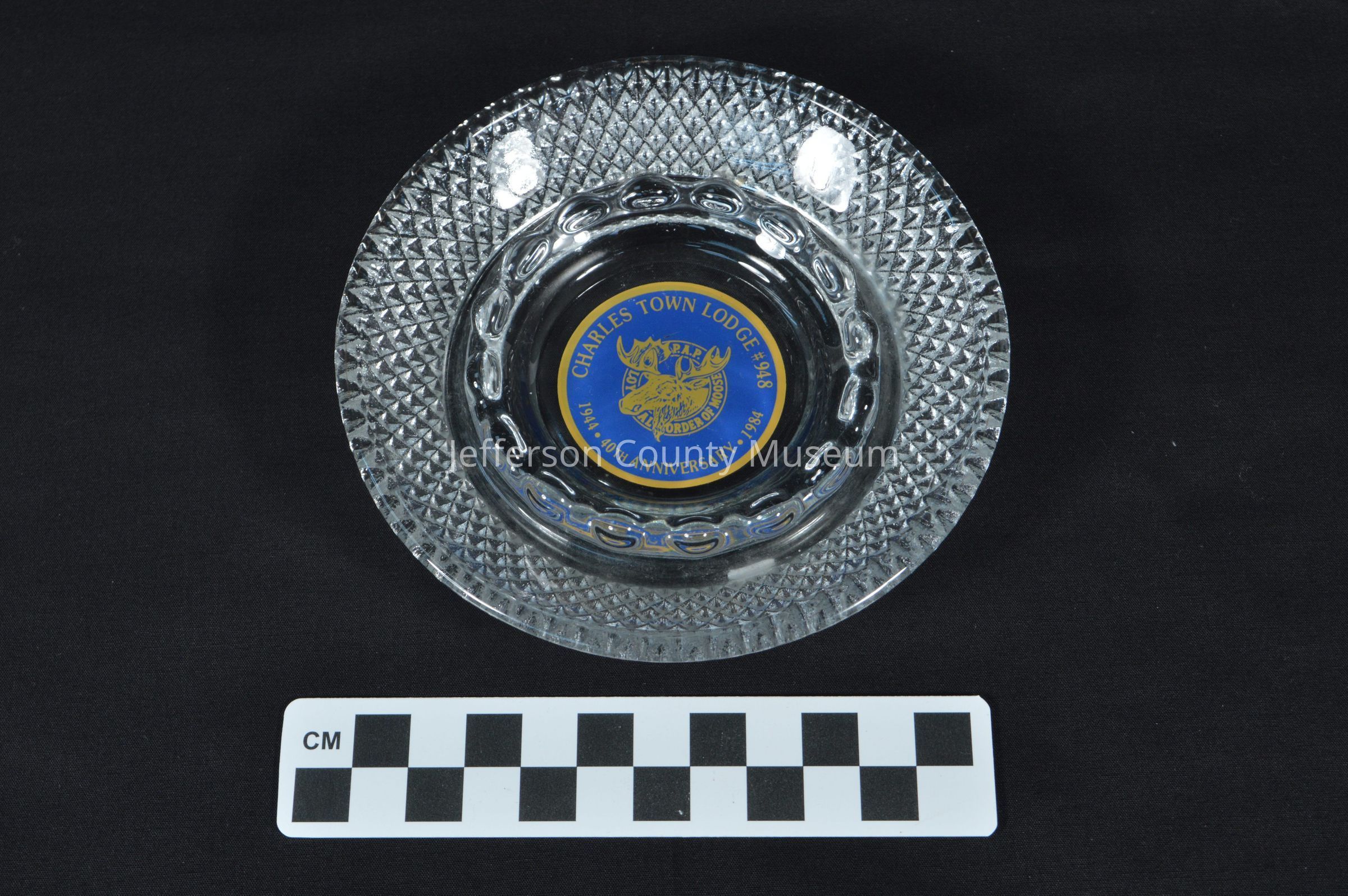 Circular clear glass ashtray, advertising Charles Town Lodge #948. Reverse image is blue circle, outlined in gold. Image of a gold moose emblem in center with gold text above that reads "Charles Town Lodge #948" and gold text below that reads "1944, 40th Anniversary, 1984"Acquisition