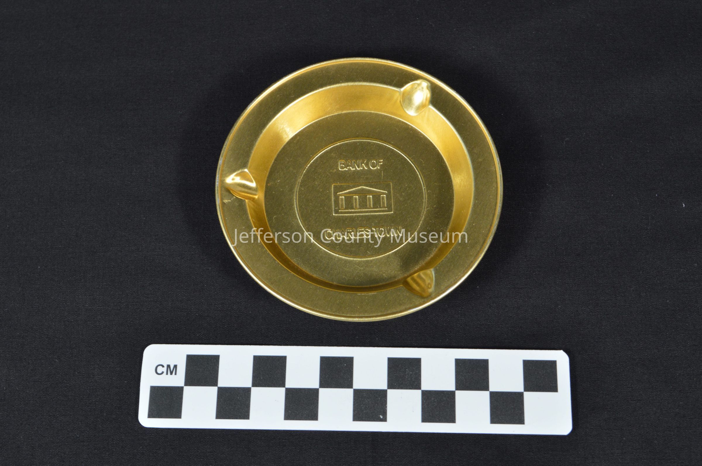 Circular gold aluminum ashtray, advertising Bank of Charles Town. There are three grooves along the rim for resting a cigarette. In the center of the tray is an embossed image of the bank building and text that reads: "Bank of Charles Town."Acquisition