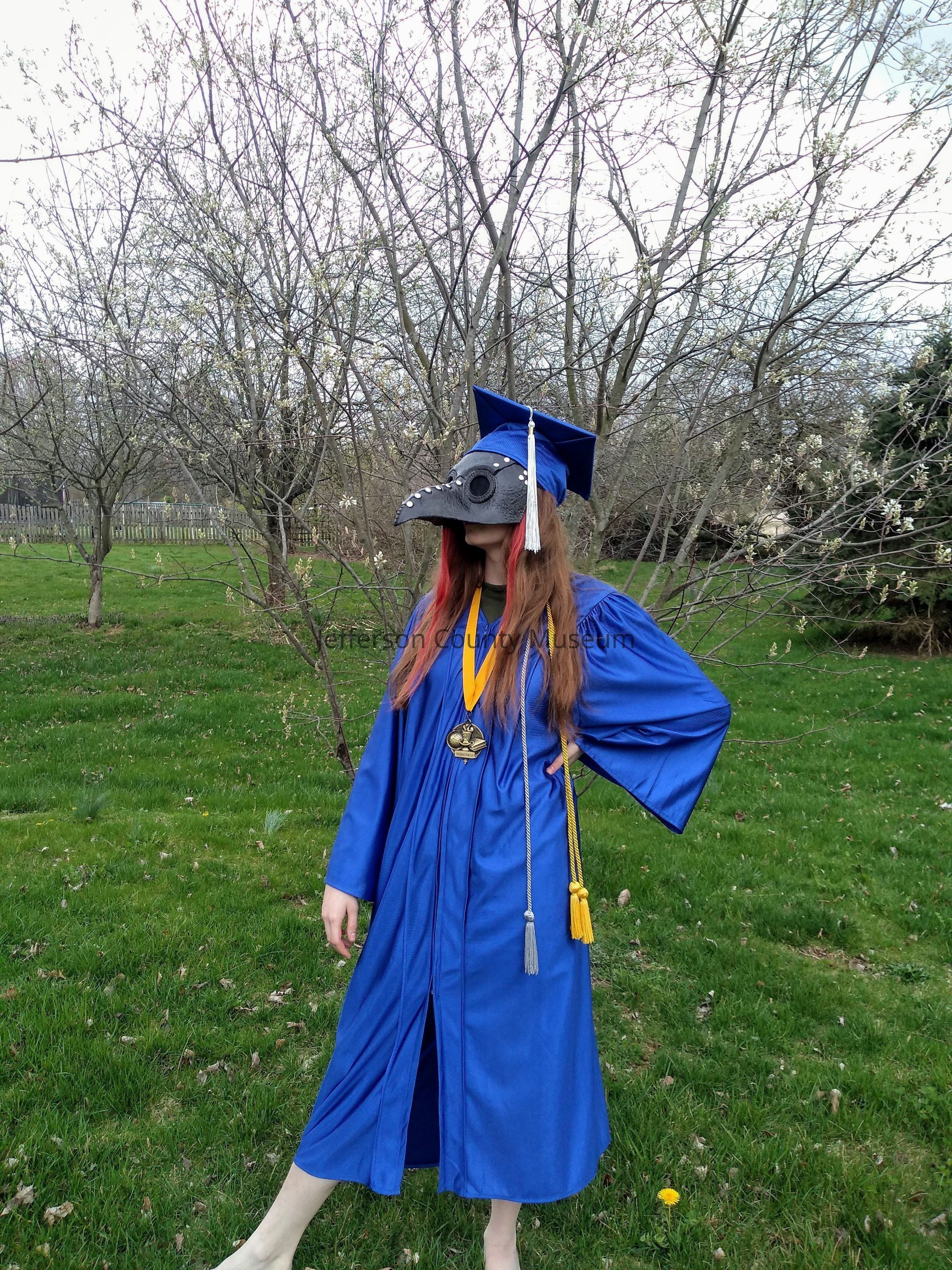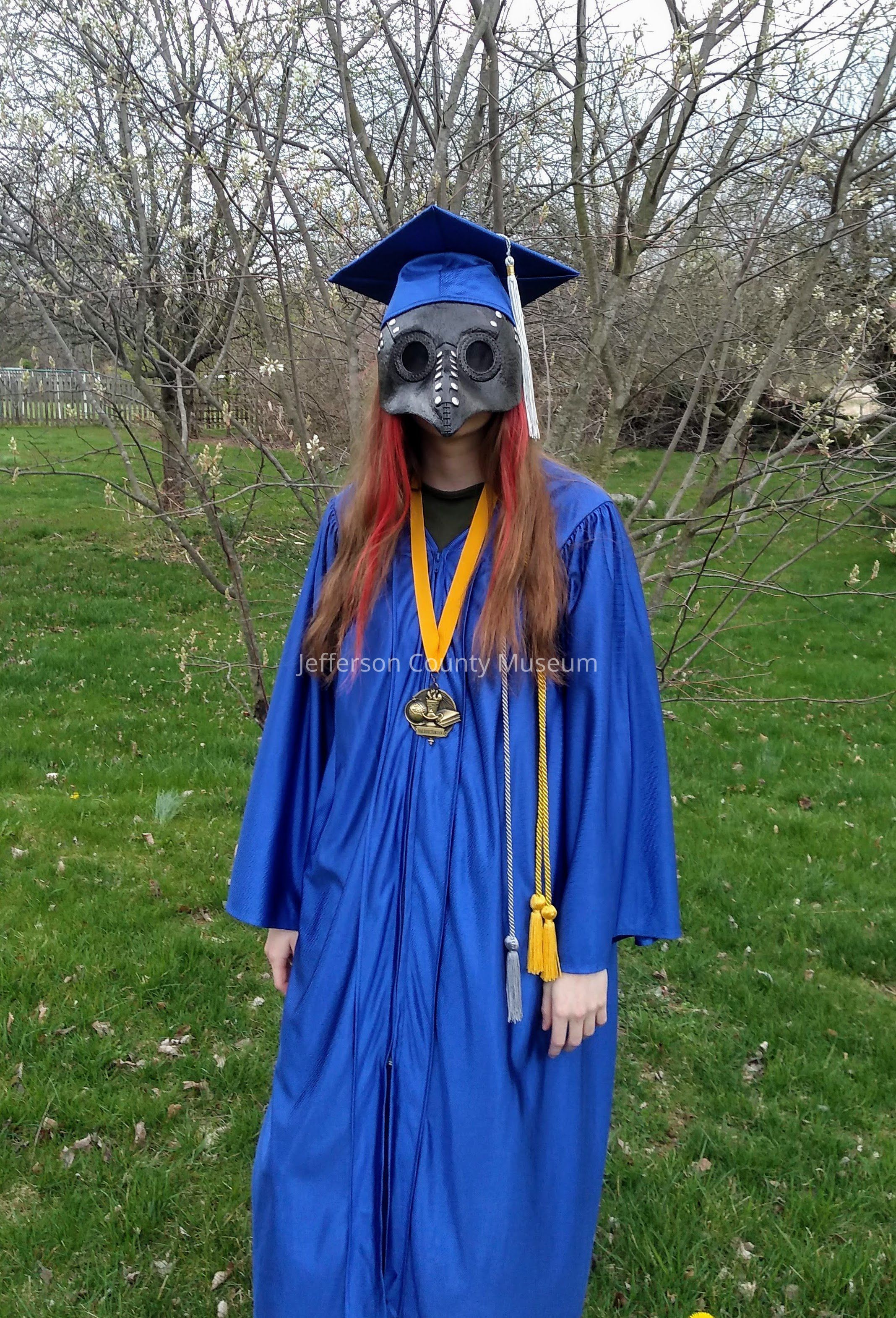 Sophia Smith in high school graduation robe with plague doctor maskEntry/Object ID