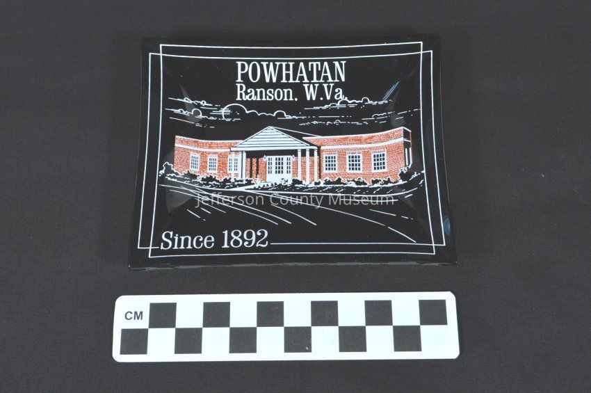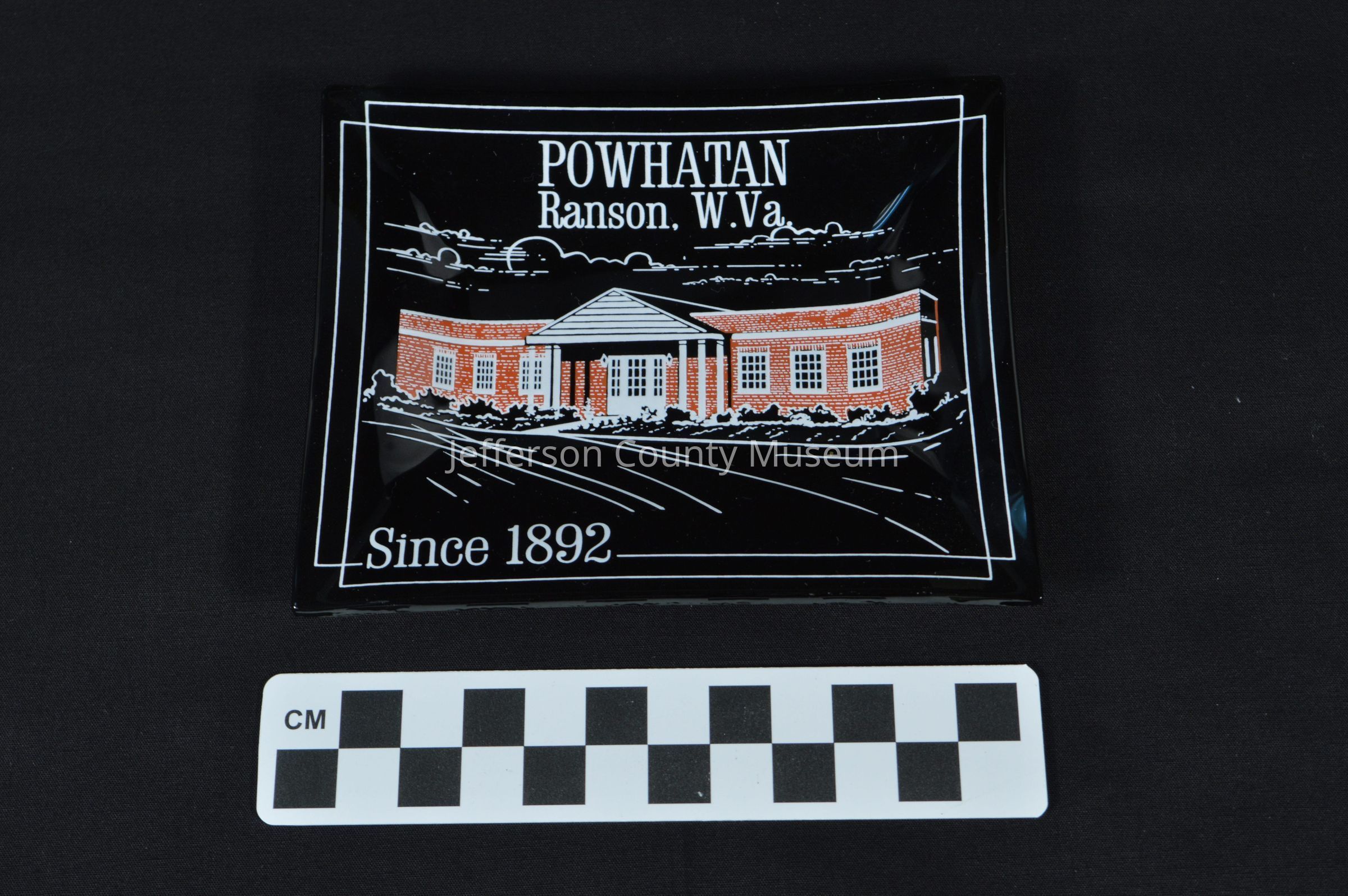 Black rectangular glass ashtray, advertising Powhatan Brass and Iron Works. Painting in center of ashtray of the Powhatan Brass and Iron Works building. Above the building is white text that reads: "Powhatan, Ranson, W. Va." and below the building is white text that reads: "Since 1892."Acquisition