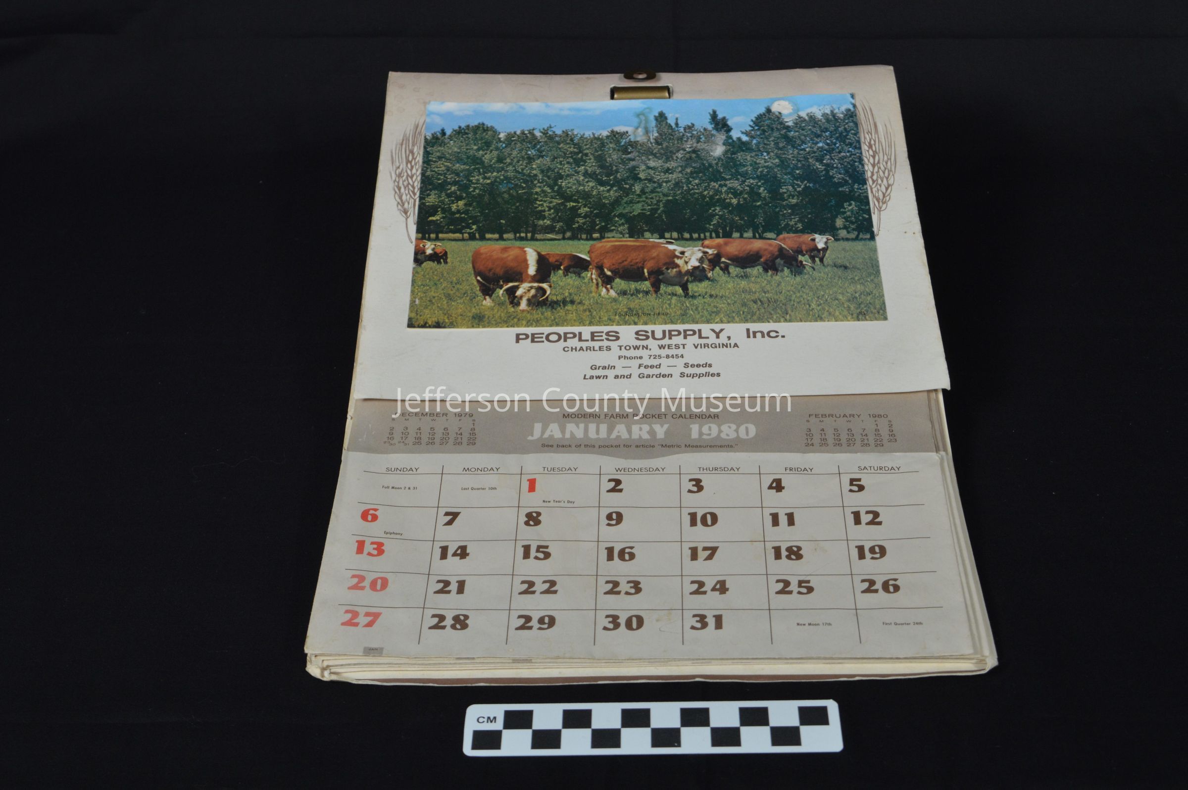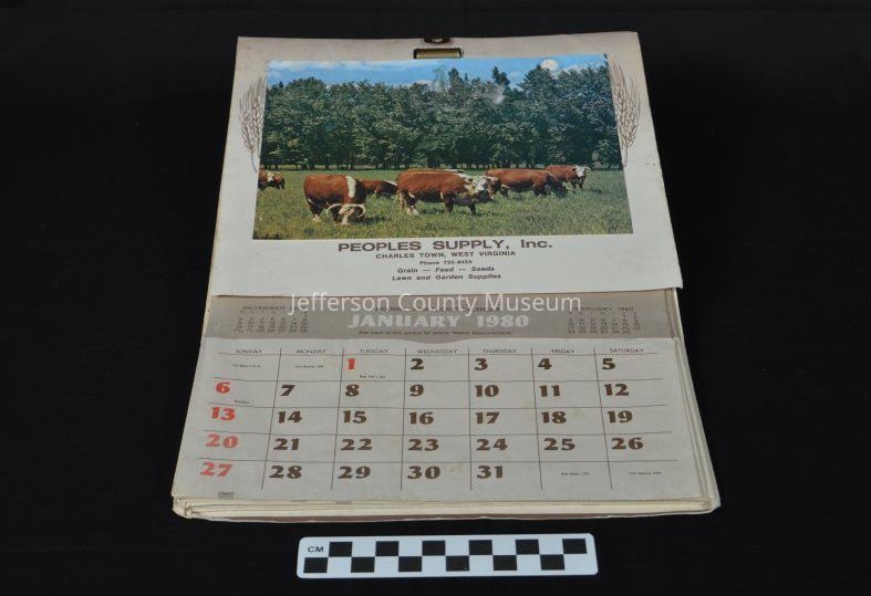 Paper wall calendar advertising "Peoples Supply, Inc., Charles Town, West Virginia, Phone 725-8454, Grain -- Feed -- Seeds, Lawn and Garden Supplies." From January 1980 to December 1980. Calendar is held together with a metal clip at the top. Advertised as the Modern Farm Pocket Calendar. The front cover has a photograph of cattle with the company's name underneath. Each page includes a monthly farm record at the top with space to input daily receipts and daily expenses. At the bottom of each page is monthly calendar with a pocket that can be used to store documents. On the back of each page is various farm information, including metric measurements and tips related to soil, cattle, pesticide, lice, and harvesting. The last page has empty tables to fill out monthly cash income and expenditures, as well as assets and liabilities for the year. On the back of the last page are two maps showing mean date of last 32 degree F temperature in spring and in autumn in the United States.Acquisition