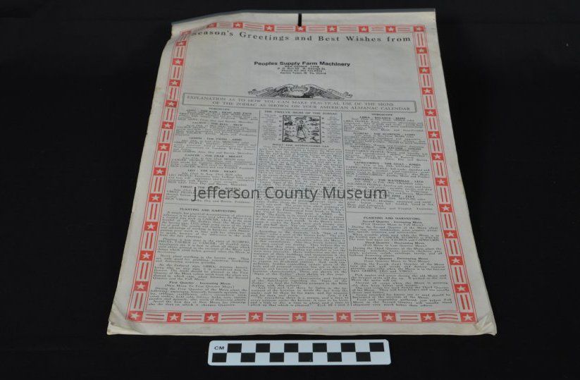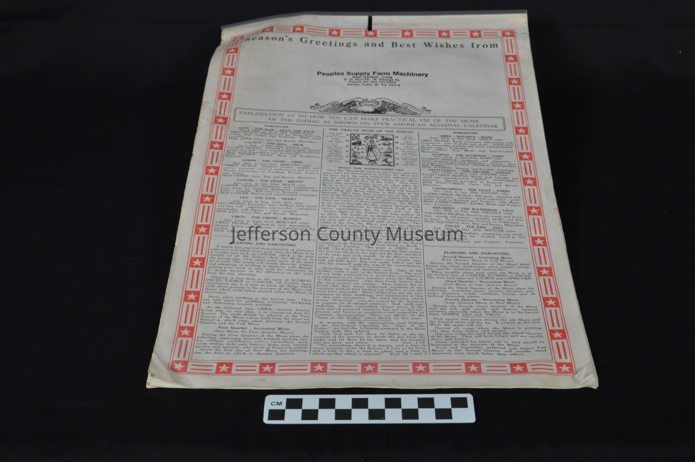 Paper wall calendar advertising "Peoples Supply Farm Machinery, New Holland, Long, P O Box 69, N. George St., Phone AC 302 725-8454, [C]harles Town, W Va. 25414." From January 1980 to December 1980. The top of the poster is braced with a metal edge. The front of the first page contains information about zodiac signs and their relation to planting and harvesting. The back of the first page includes a stock gestation table and empty fields for a stock breeding record, poultry breeding record, and memorandum. Each page has a drawing of farm machinery at the top and a monthly calendar underneath. Each day includes the sun rise time, sun set time, moon rise/set time, and day's length. A weather chart for the month is included at the bottom of each page. The front and back of the last page contains accidents and first aid information, planting information, and housekeeping information.Acquisition