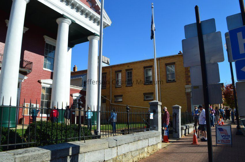 IMG3787005: Early voters in line at Jefferson County Courthouse. Line extends along East Washington Street.