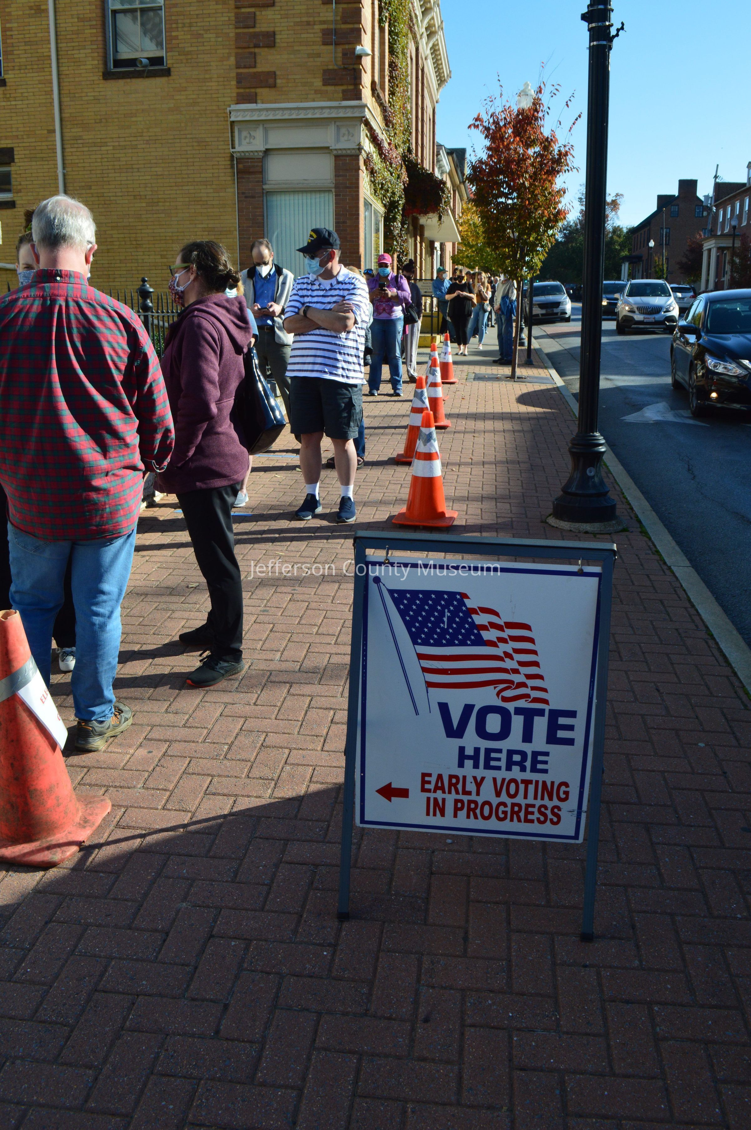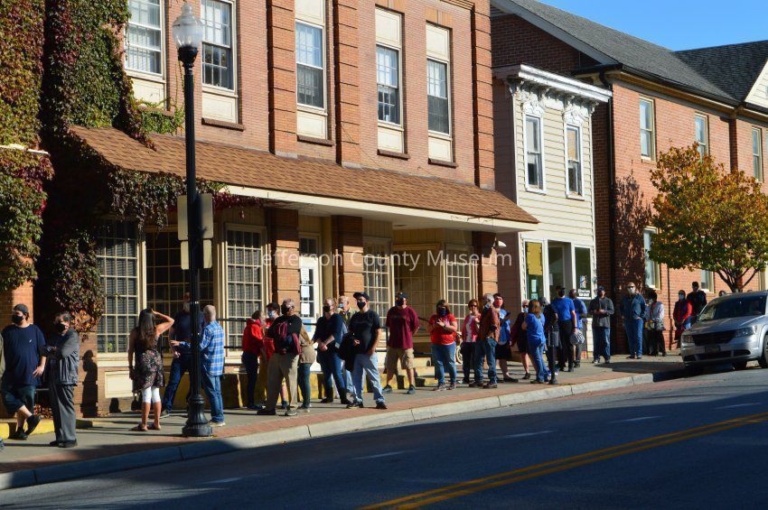 Early voting at Jefferson County Courthouse in Charles Town, during COVID-19 pandemic, in October 2020. People wearing masks and social distancing while in line waiting to vote.