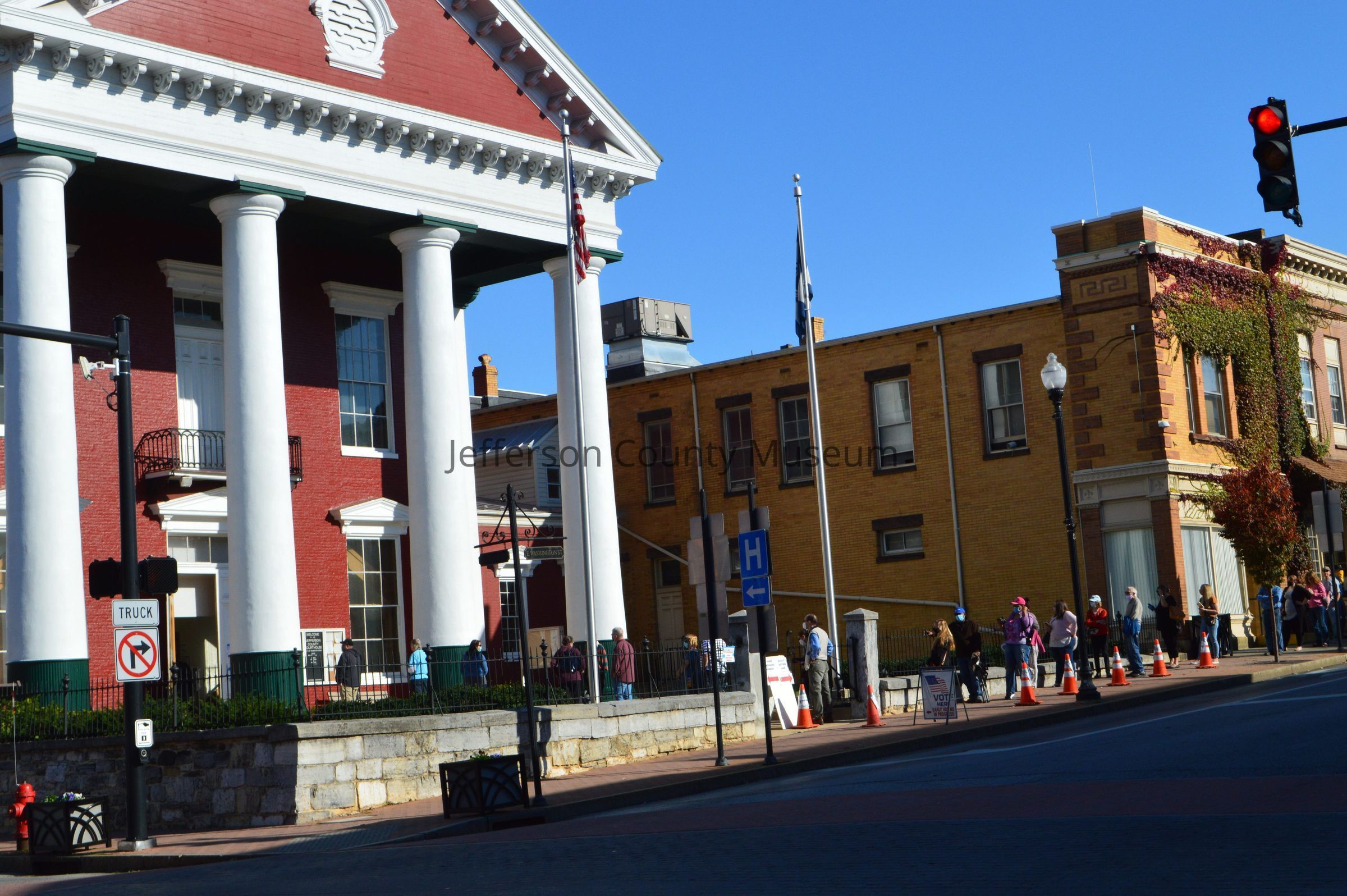 IMG3787002: "VOTE HERE. EARLY VOTING IN PROGRESS" sign next to early voters in line at Jefferson County Courthouse. Line extends along East Washington Street.