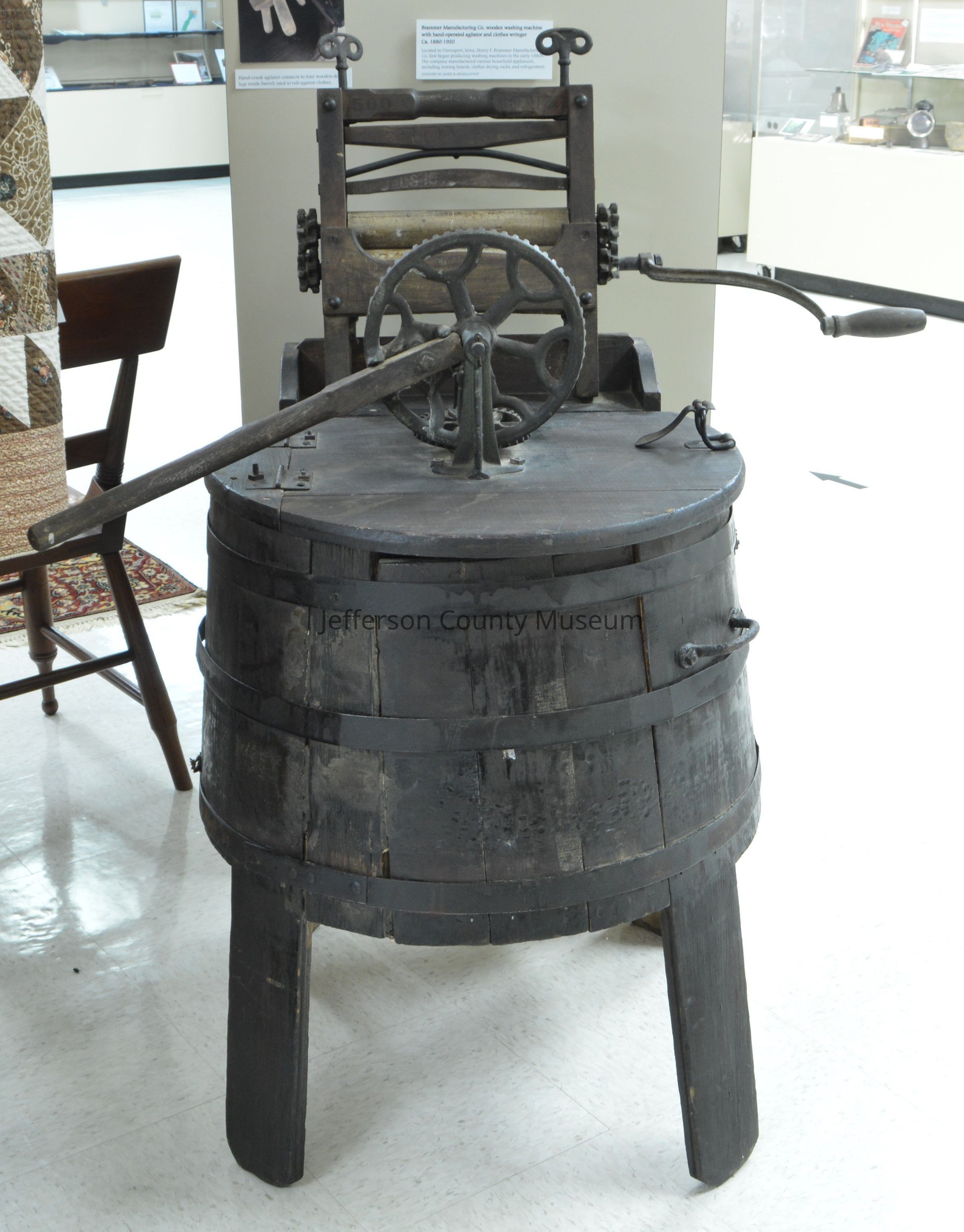Wooden barrel washing machine, made by Brammer Manufacturing Co., Davenport, Iowa, with hand-operated agitator and Horse Shoe Brand clothes wringer. Likely from between the late 1800s to early 1900s.