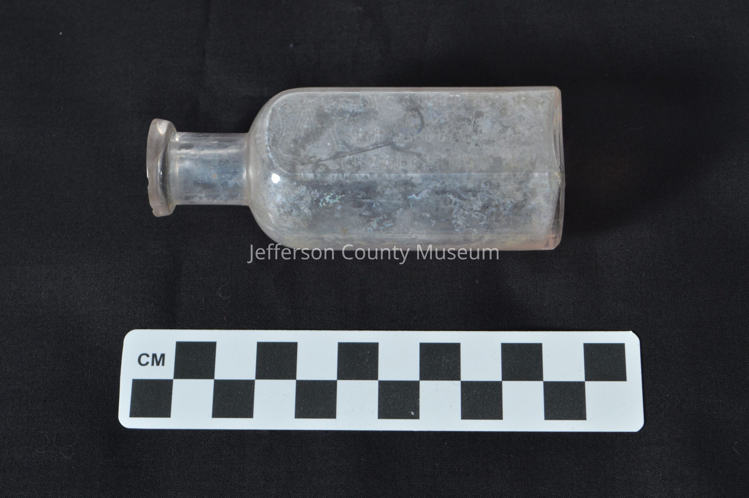 Clear glass pharmacy bottle. Embossed on front: "AISQUITH & CO PHARMACISTS, CHARLESTOWN, W.VA." To left of text is embossed shield shape with an "A" inside. Embossed on bottom of bottle: "W.T. & CO. PAT JAN 22 78 H U.S.A."Acquisition