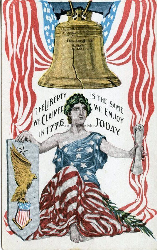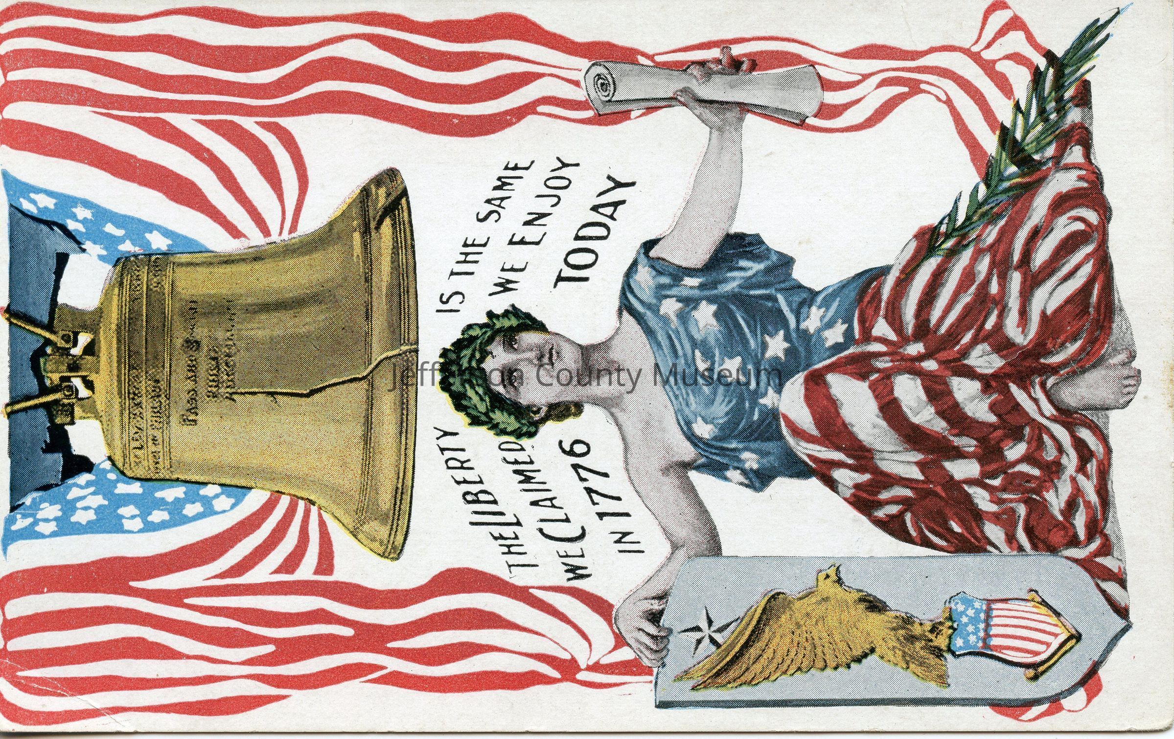 Liberty dressed in the American flag with two flags draped over the Liberty Bell and around sides. Liberty supports a shield with her right hand with a star, eagle and American flag shield on it. Her left hand holds a scroll. Around Liberty are the words THE LIBERTY WE CLAIMED IN 1776 IS THE SAME WE ENJOY TODAY. Back of card says POST CARD and PLACE STAMP HERE. Just below that is THIS SIDE FOR ADDRESS ONLY.Acquisition
