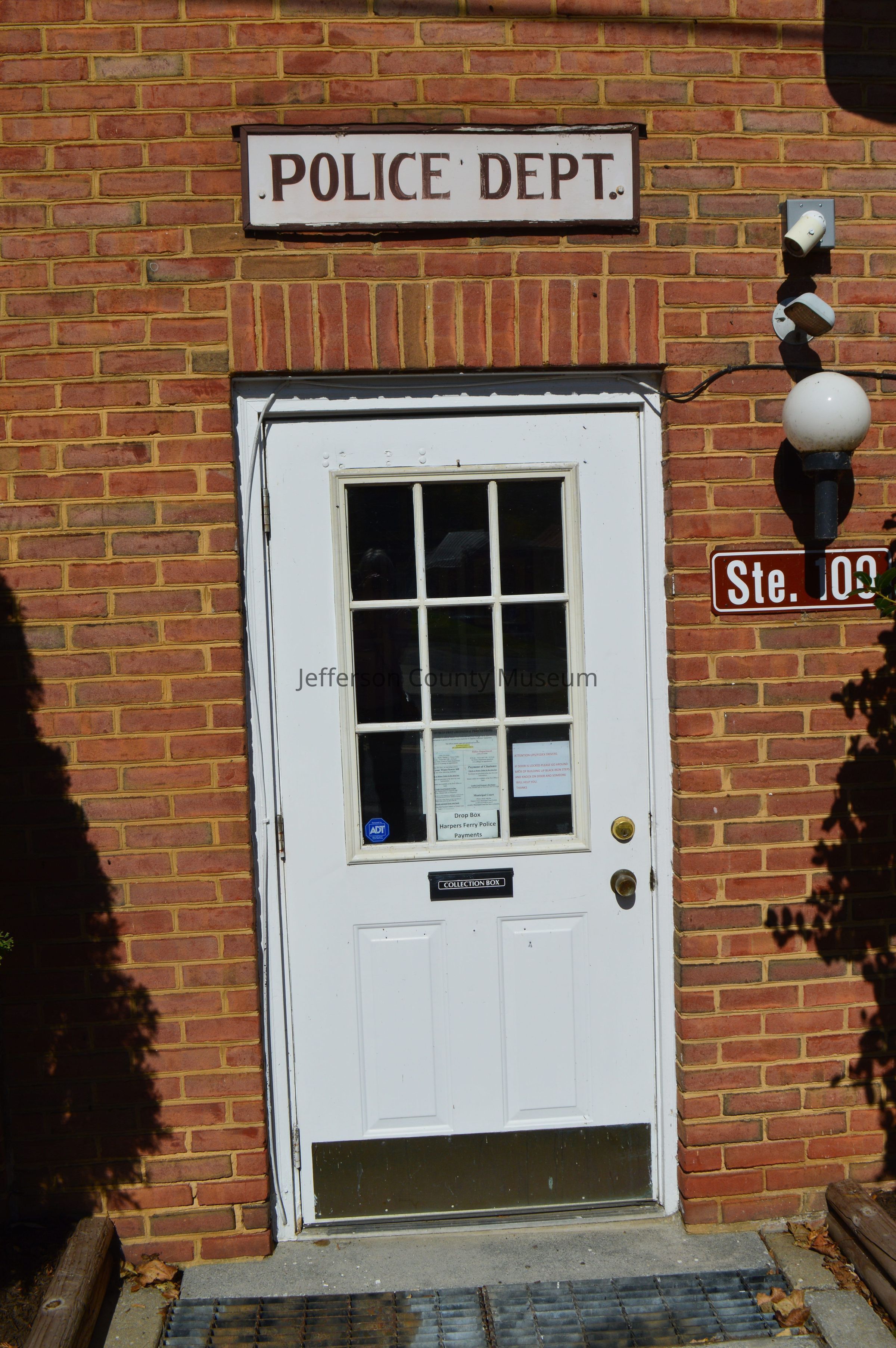 IMG3793-1: Front door of Harpers Ferry Police Station. Sign above door reads "POLICE DEPT."