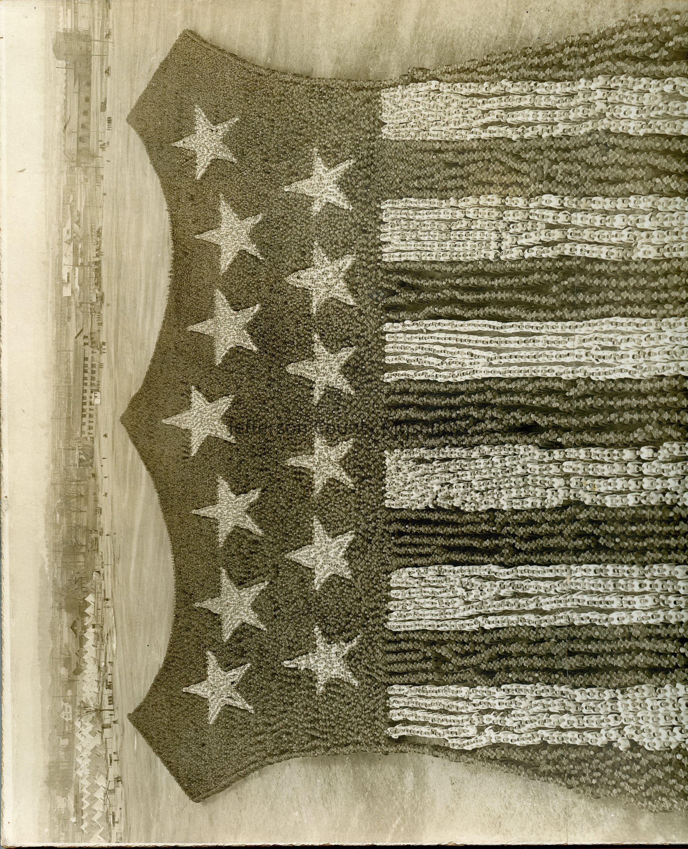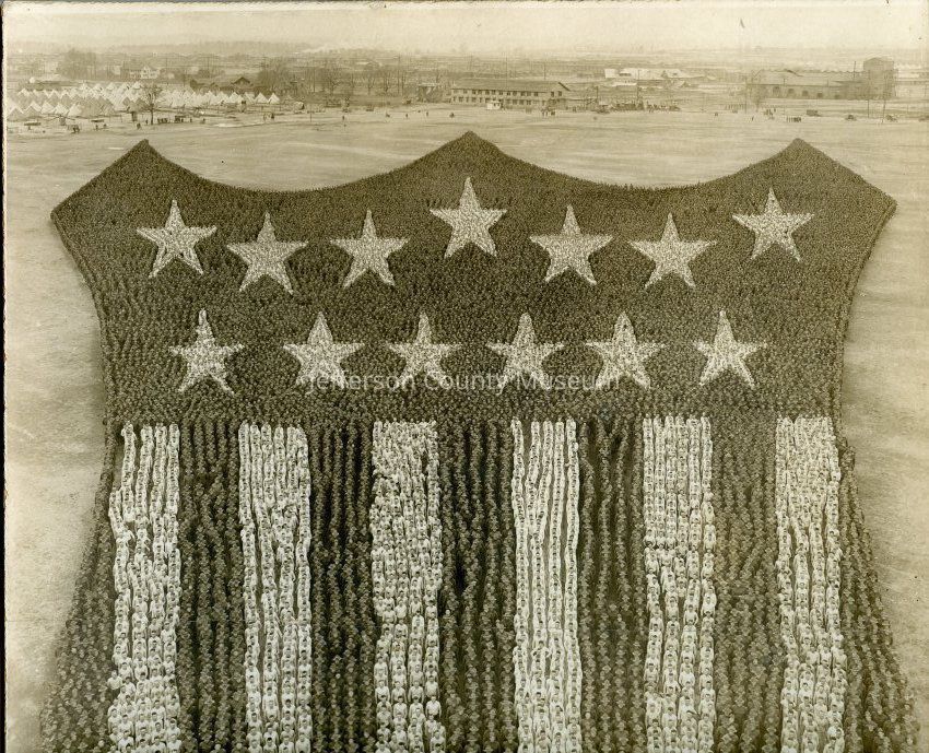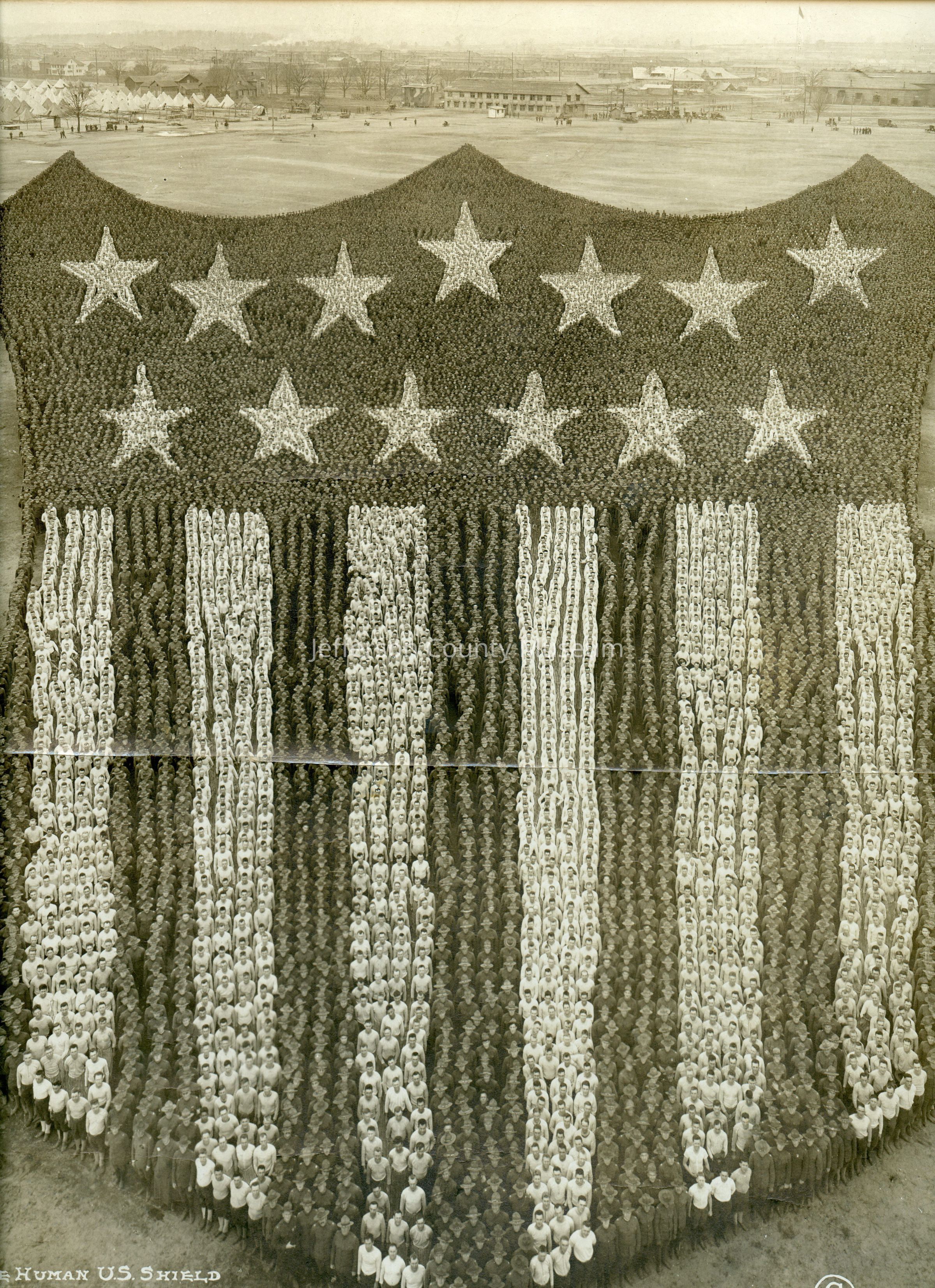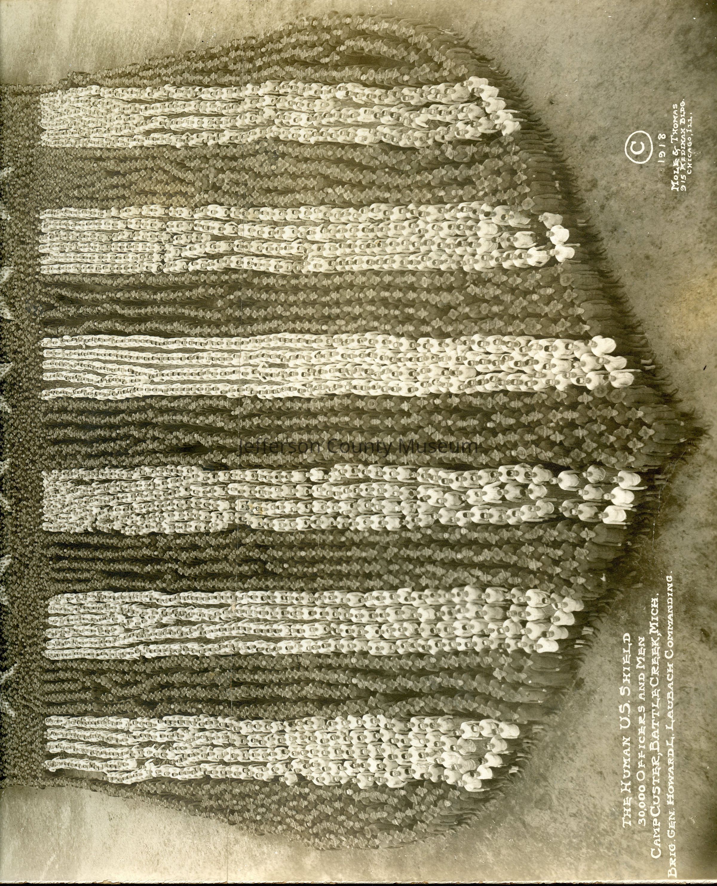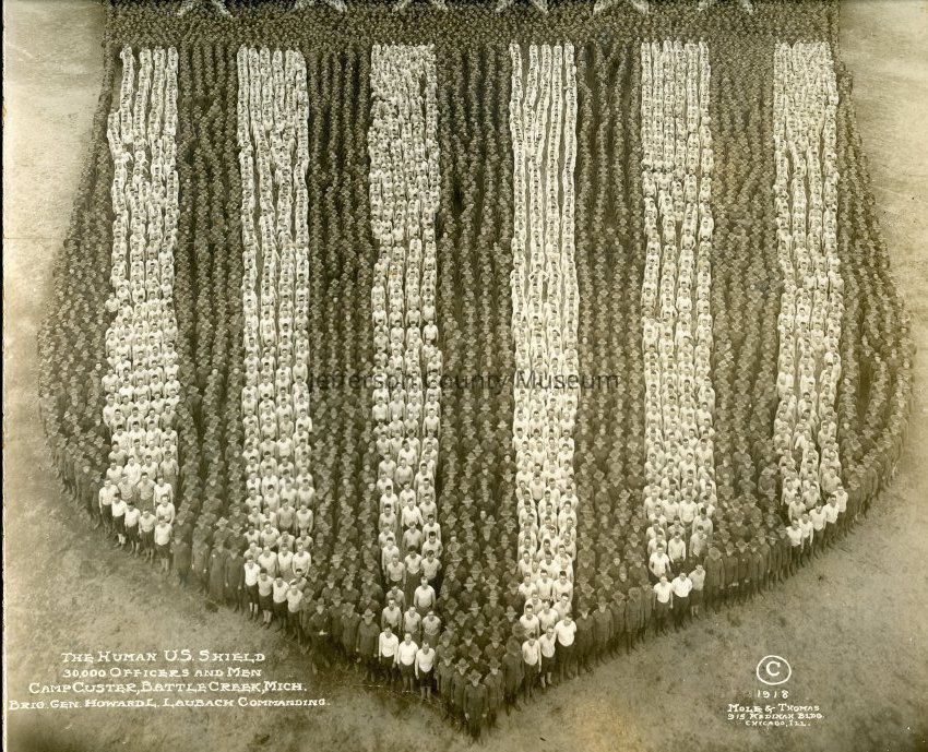 Sepia tone print taken from the original Gelatin print by Mole and Thomas at the Metropolitan Museum of Art, New York (www.metmuseum.org/art/collection/search/265552), depicting World War I soldiers; titled " THE HUMAN SHIELD, 30,000 OFFICERS AND MEN, CAMP CUSTER, BATTLE CREEK, MICH., BRIG. GEN. HOWARD L. LAUBACH COMMANDING " In right corner is large " C " in a circle. Below that are the date " 1918 " and " Mole & Thomas 915 Medinax Bldg. Chicago, Ill "Acquisition