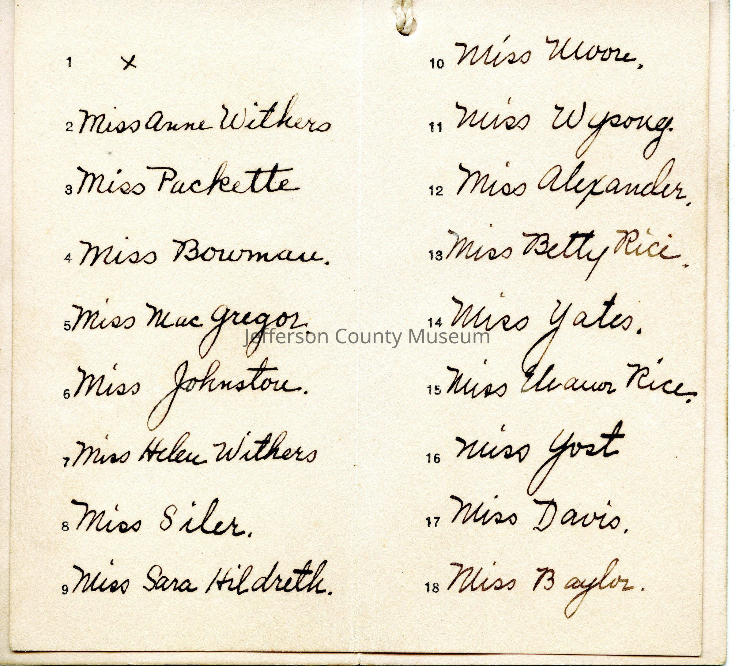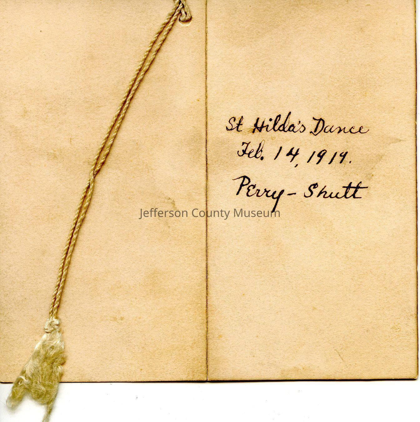 Small, ecru color, paper dance card folded in half lengthwise with second sheet of paper inside and both sheets held together by a cord looped through a small hole punched in top of both papers. Handwritten in ink on front of card: "St. Hilda's Dance / Feb. 14, 1919. / Perry - Shutt". Inside on second sheet of paper are printed numbers 1 through 18 with names of St. Hilda's students handwritten by each number (see People).Acquisition