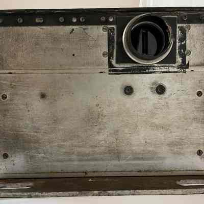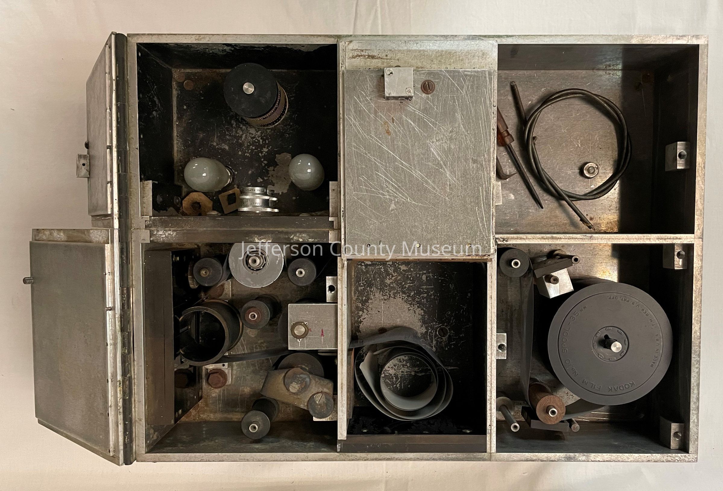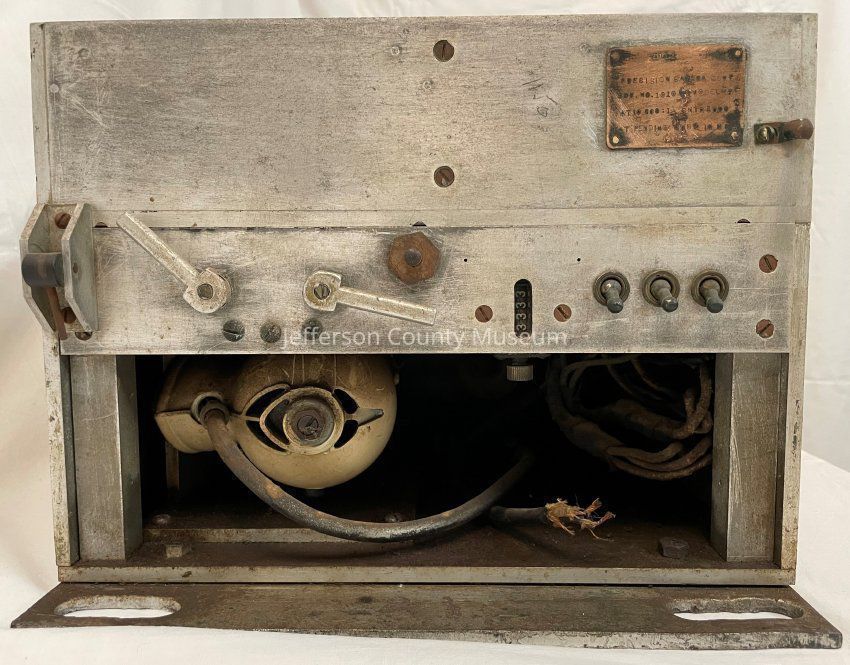 Strip-film photo-finish camera made by Jones Precision Photo-Finish, Inc. Five compartments at top of camera. Contains Kodak Film No. 10 Spool-35 mm film. Film runs through three compartments. One compartment has lens, reel with date October 10, 1959 on it, and two light bulbs. One compartment holds storage and contains two spare light bulbs, a screwdriver, wrench, wire, screw, and metal block. Front of camera has large lens. Back of camera has exposed wiring and copper plaque that reads: 011 PRECISION CAMERA CORP. SER. NO. 1010 MODEL (?) RATIO 300:1 CNTR 1000 PAT PENDING MADE IN U.S.A.