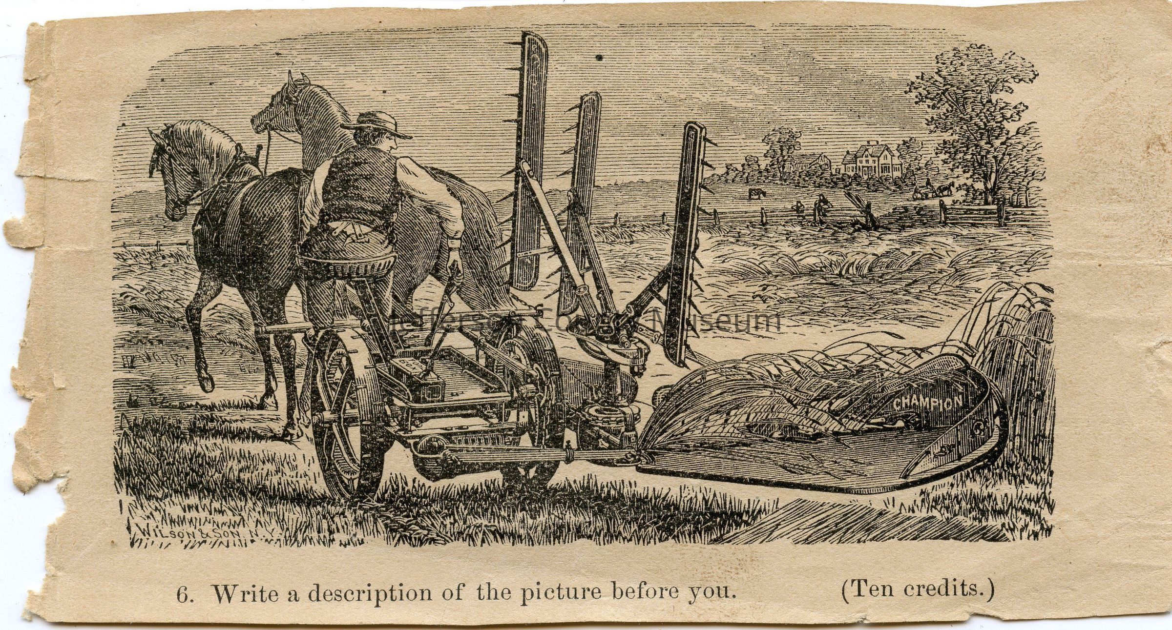 Taken from a 19th century school book. Shows farmer using horse-drawn machinery. At bottom "6. Write a description of the picture before you. (Ten credits.)".Acquisition