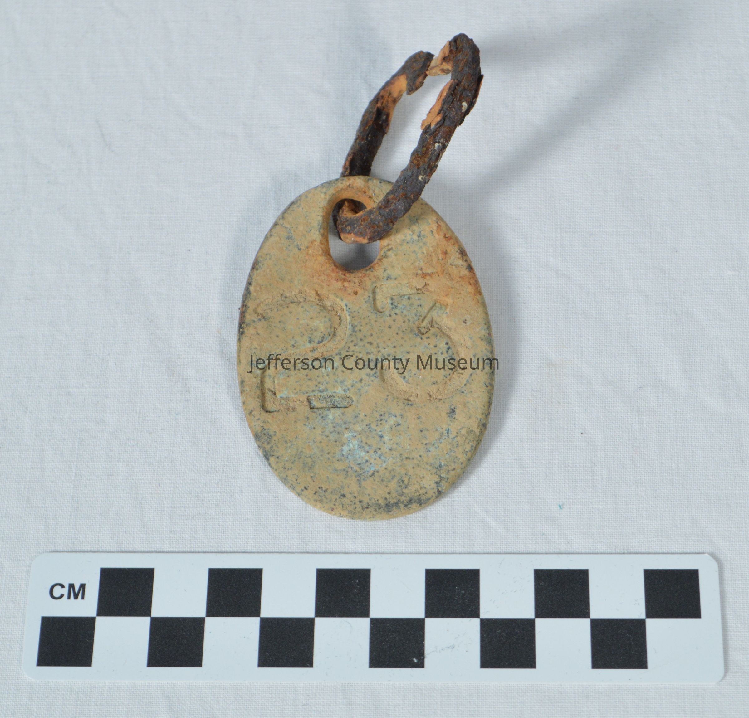 Oval, brass, animal-chain tag with link fastener. Stamped onto the tag is the number "23." Tag would be attached via the link fastener to a chain worn around the animal's neck. Likely for a dairy cow.Acquisition