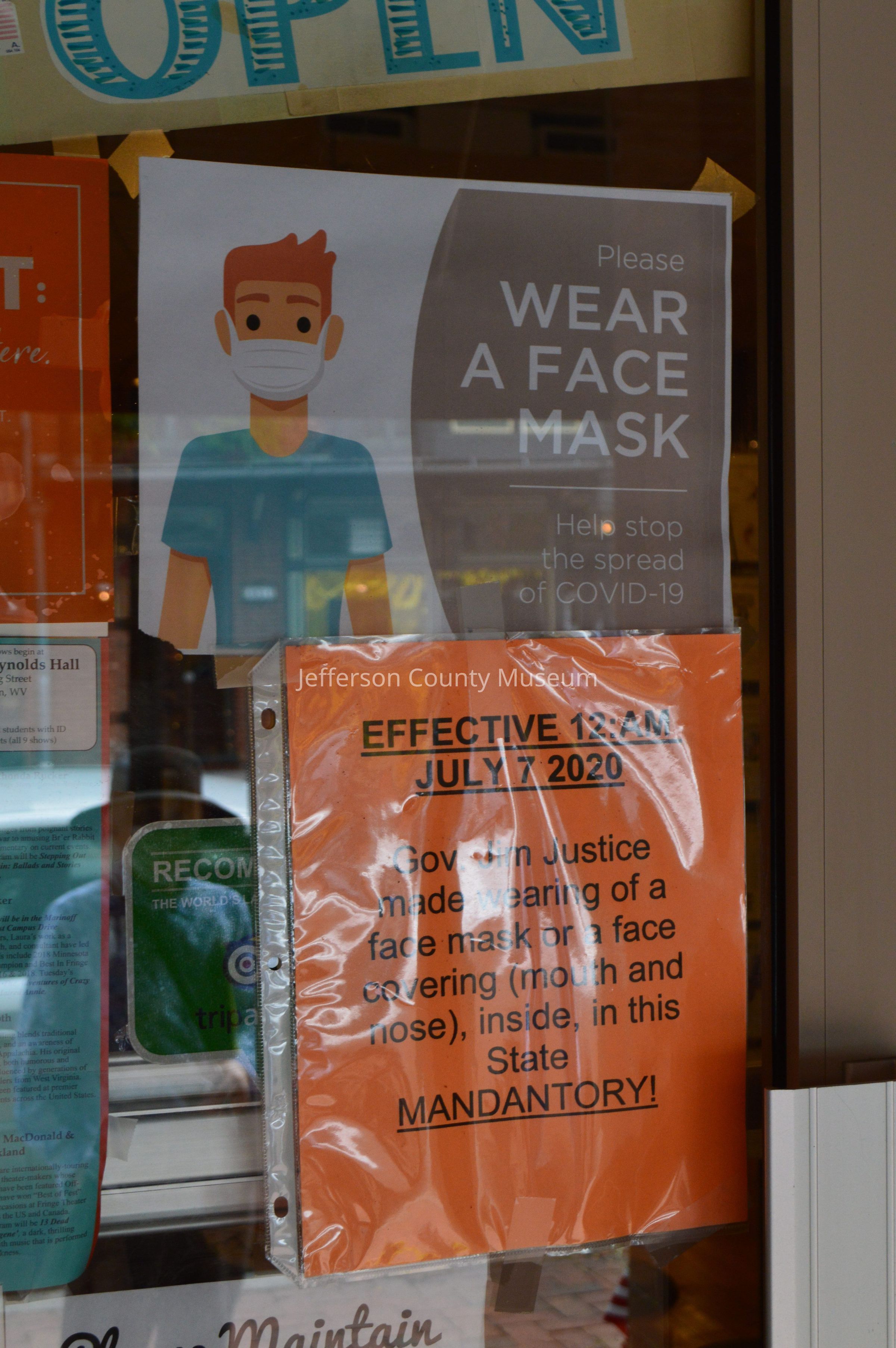 IMG3801002: Signs in window of front door of Dickinson & Wait Craft Gallery asking customers to wear a face mask and informing them of Governor Jim Justice's mandate that people must wear face masks when inside a building.