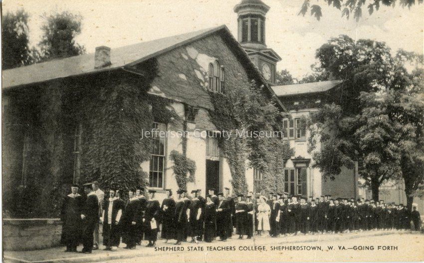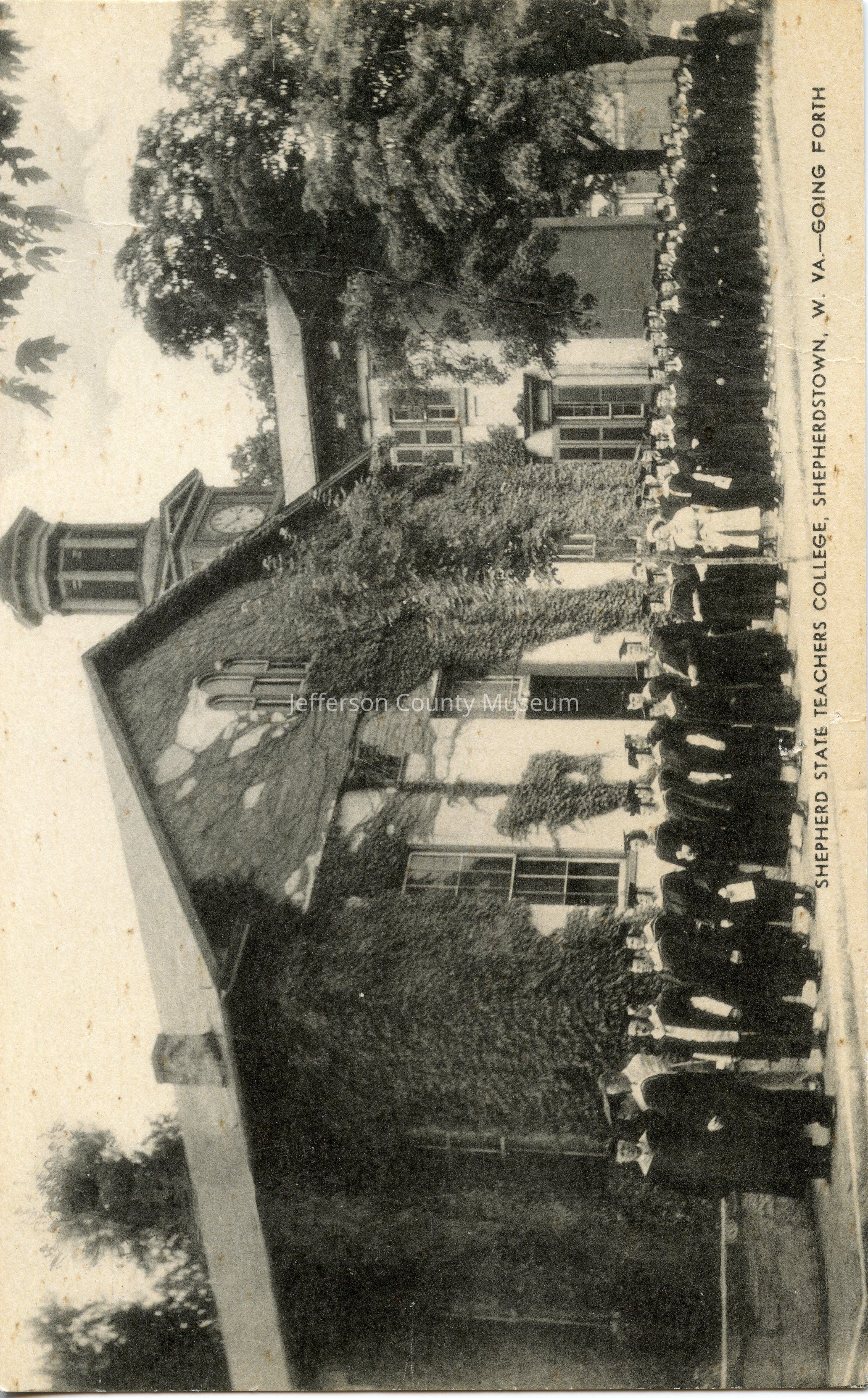 Ivy-covered building (Reynolds Hall) with long line of people wearing caps and gowns. In background are the steeple and clock of McMurran Hall. At bottom of card is SHEPHERD STATE TEACHERS COLLEGE, SHEPHERDSTOWN, W. VA.--GOING FORTH. On back is standard postcard layout.Acquisition