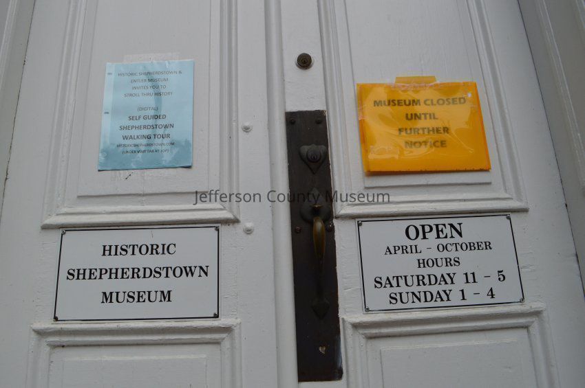 IMG3802002: Front door of Historic Shepherdstown Museum with sign that reads: MUSEUM CLOSED UNTIL FURTHER NOTICE. The Historic Shepherdstown Museum closed for a period of time due to the COVID-19 pandemic.