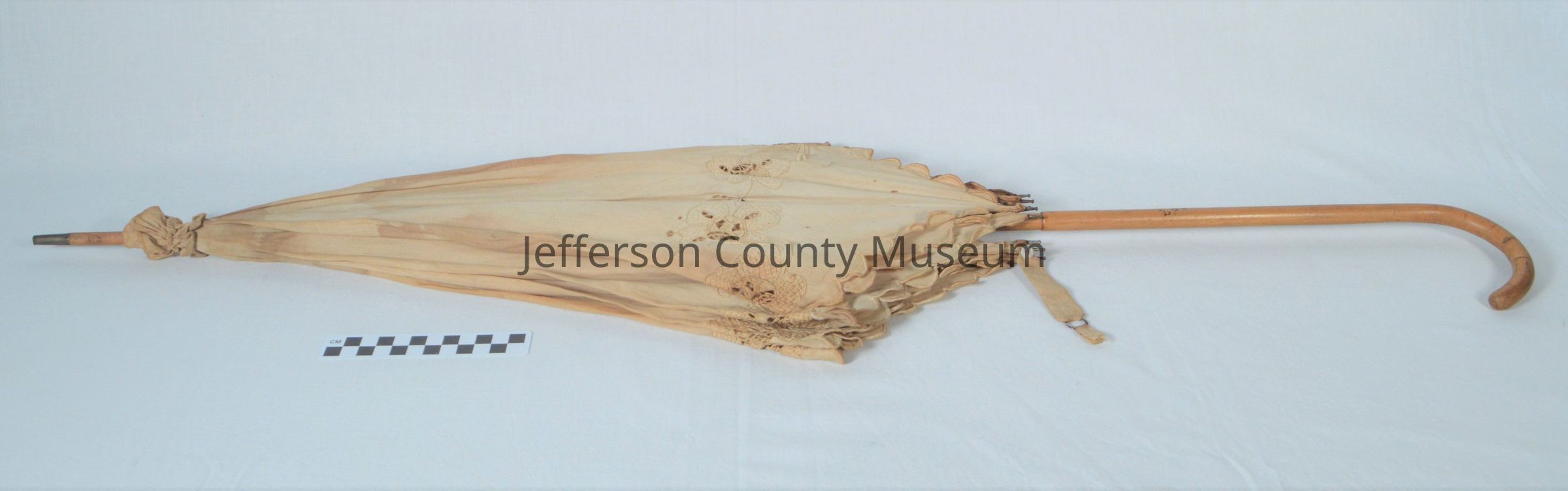 Off-white cotton parasol with decorative flower embroidery or crocheting along bottom of cover. Wooden shaft and handle. Metal cap. Handle is curved. Possibly belonged to Margaret Chew Osburn.