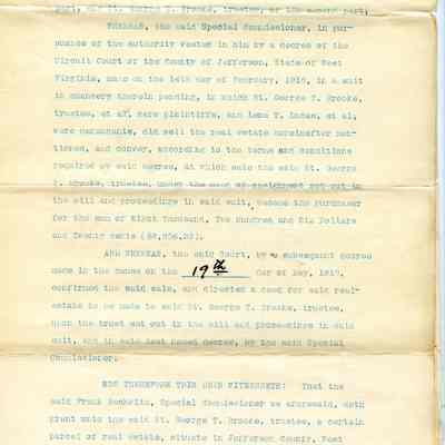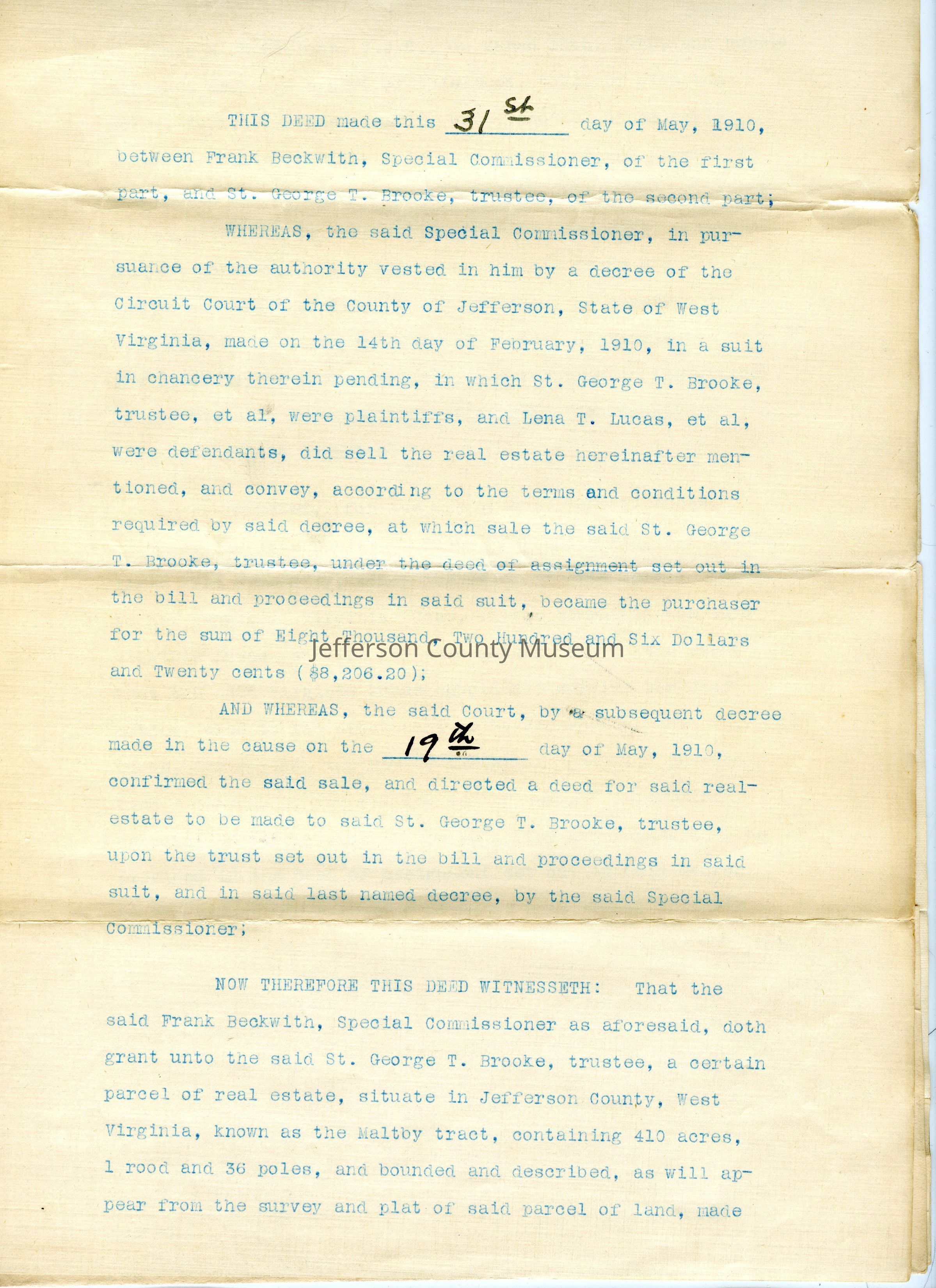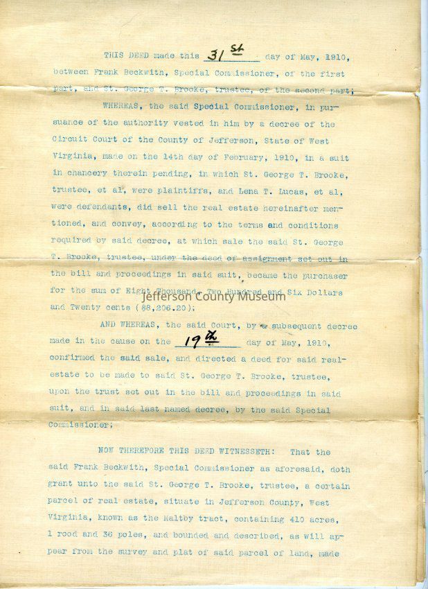(a) Two-page deed between Frank Beckwith, Special Commissioner, and St. George T. Brooke, Trustee, in which Beckwith grants Brooke the Maltby tract.