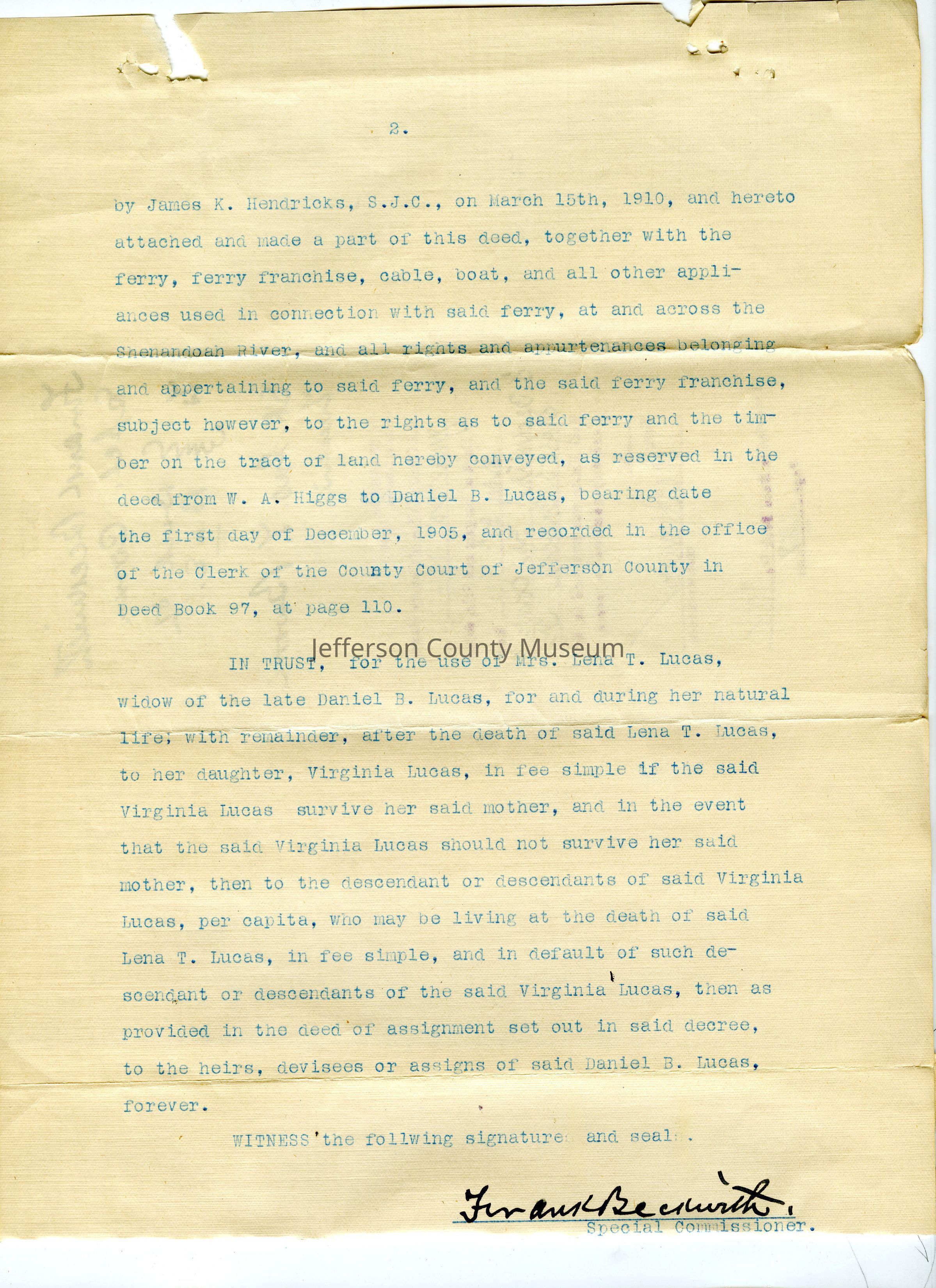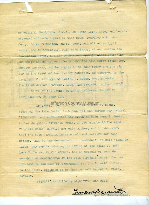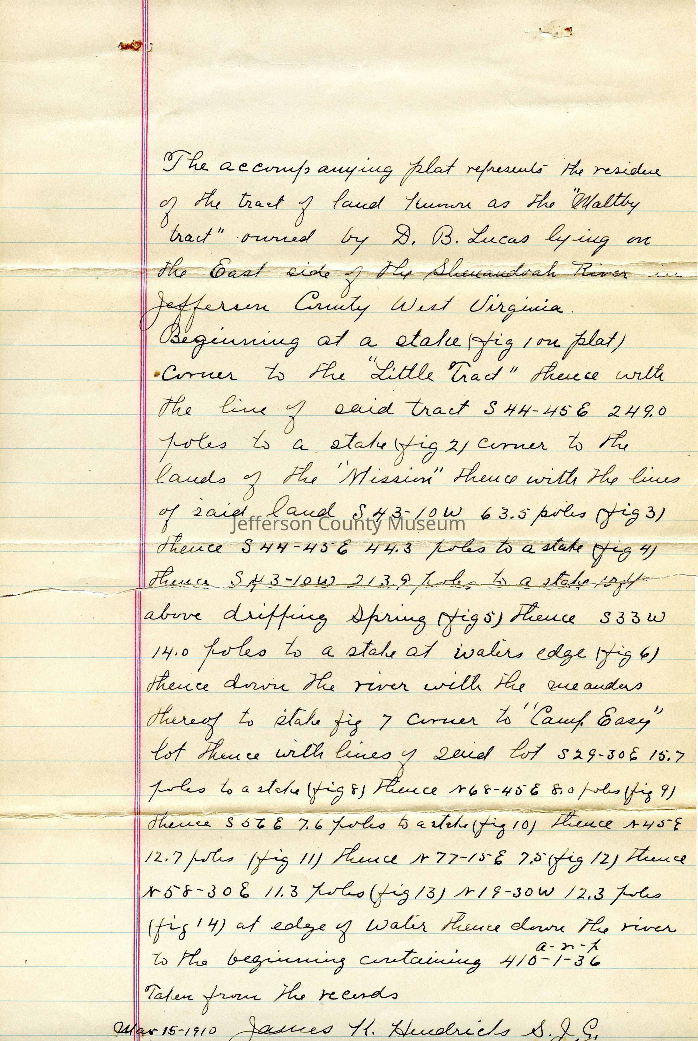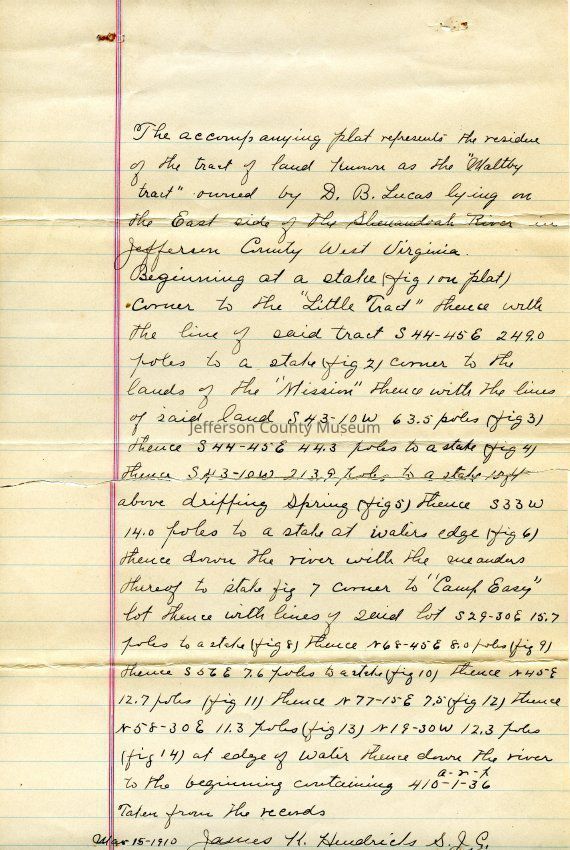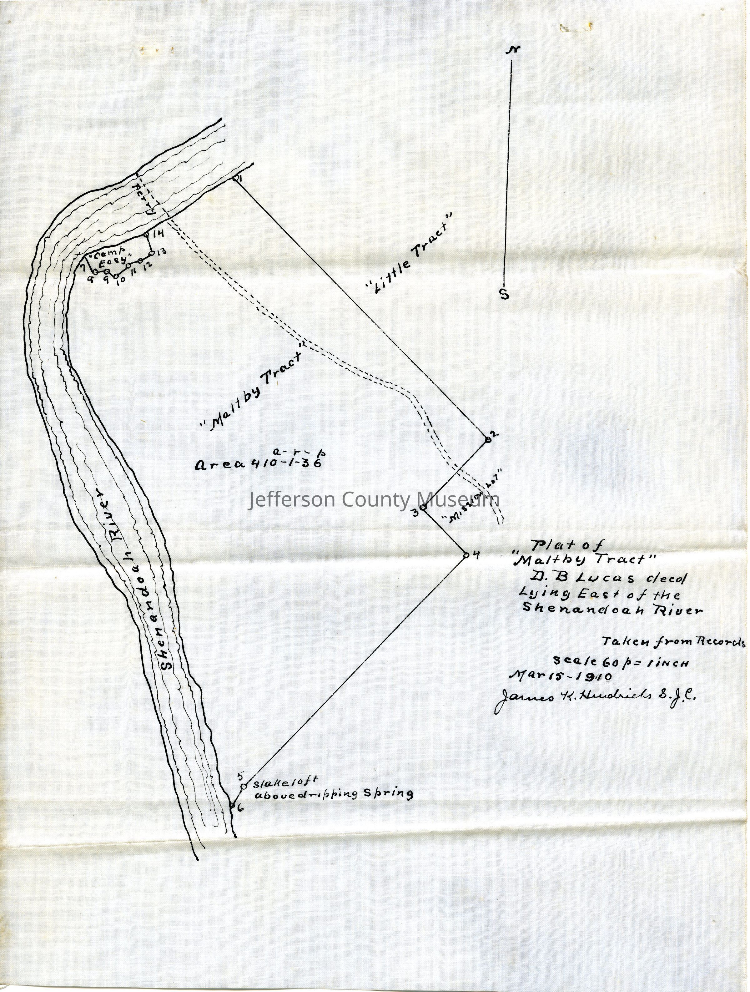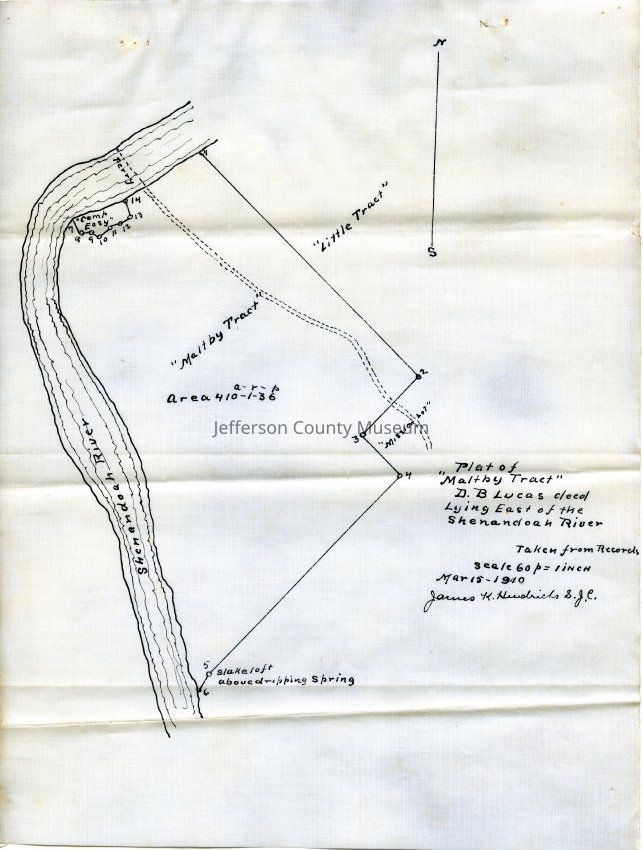 (b) Survey of the Maltby tract owned by D. B. Lucas on the east side of the Shenandoah River in Jefferson County. Survey dated Mar 14, 1910, and taken from the records by James K. Hendricks.